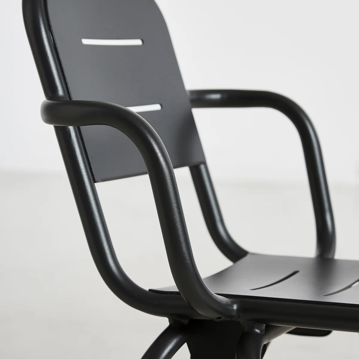 De Ray Café Armchair van Woud maakt deel uit van een serie buitenmeubilair voor privé en publiek gebruik. De visueel aantrekkelijke serie stoelen en tafels is ontworpen door Fasting en Rolff. De fauteuil overtuigt door zijn zachte rondingen en het robuuste, gepoedercoate aluminium. De stoel staat goed op het balkon of terras, maar ook voor een café en restaurant.