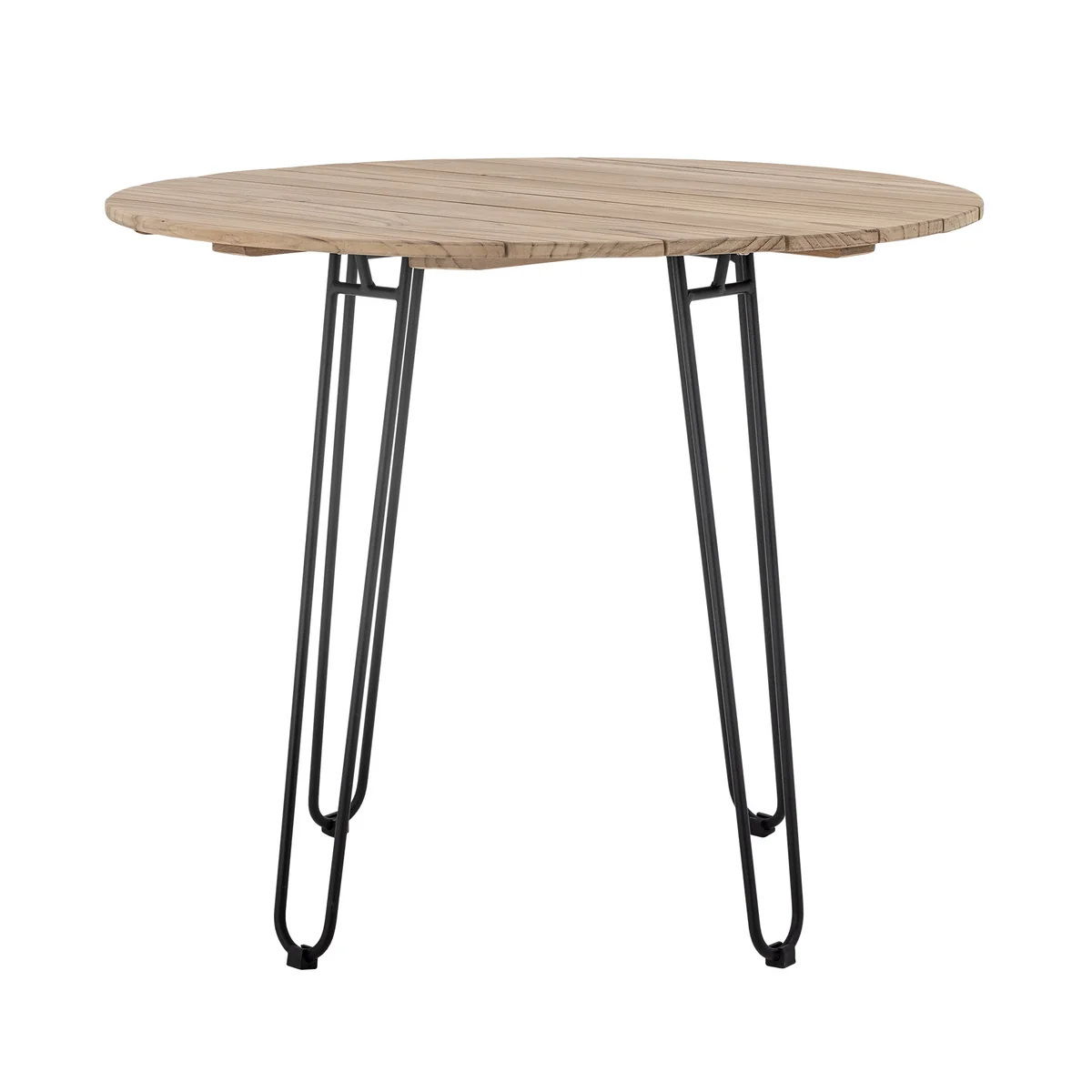 De Molito eettafel van Bloomingville combineert natuurlijk teakhout met een modern zwart metalen onderstel. De fijne teakhouten latten geven het tafelblad een elegante uitstraling, terwijl de metalen poten zorgen voor stabiliteit en een eigentijds contrast. Gemakkelijk te verplaatsen en perfect voor vier personen - ideaal voor gezellige maaltijden op het balkon of terras.
