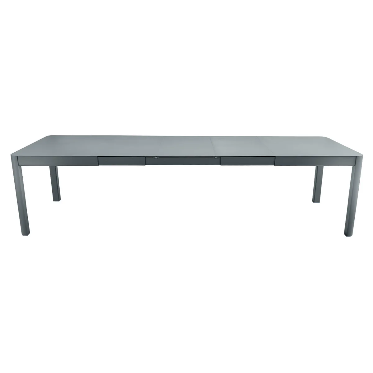 De Ribambelle tuintafel van Fermob biedt plaats aan 6 tot 8 personen - met of zonder extra tafelblad. Dankzij een telescopisch systeem met rails kan het verlengblad gebruikt worden om gasten in een handomdraai twee extra zitplaatsen te bieden. Het opbergvak onder het tafelblad is ook erg handig. Trouwens: in elkaar geschoven is het niet herkenbaar dat Ribambelle een uitschuifbare tafel is.