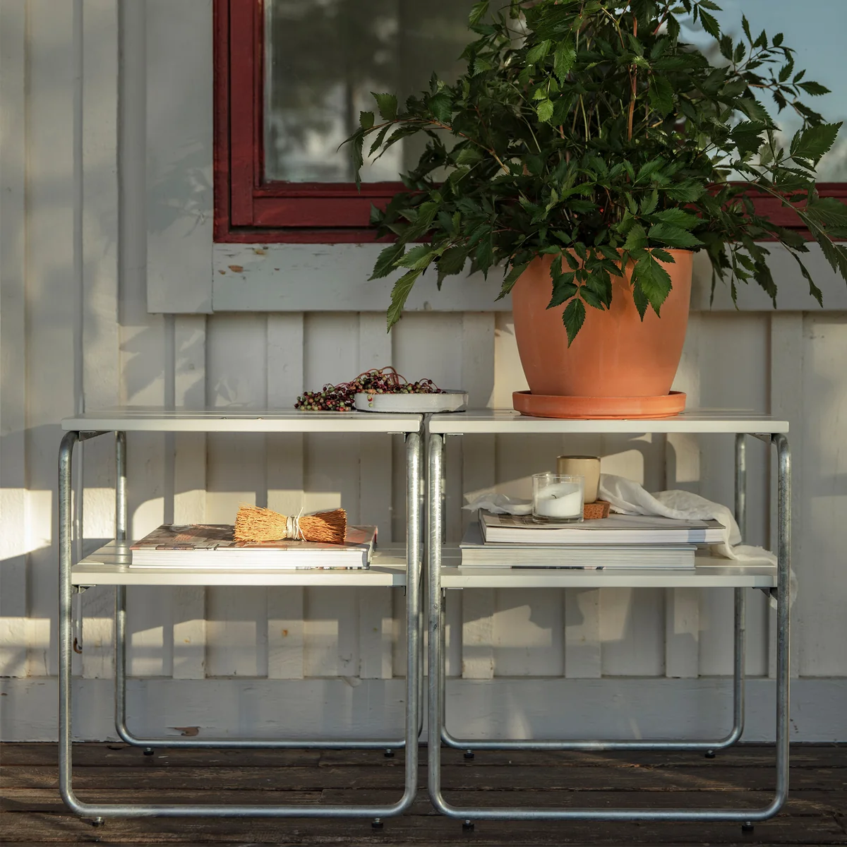 De L45 tuinbijzettafel, ontworpen door Maria Håård en Jan-Olof Ågren voor de Zweedse fabrikant Grythyttan, past perfect in de klassieke serie. Dankzij de twee niveaus is hij bijzonder praktisch en kan hij op veel verschillende manieren worden gebruikt. Afhankelijk van de voorkeur is de bijzettafel verkrijgbaar in verschillende uitvoeringen.