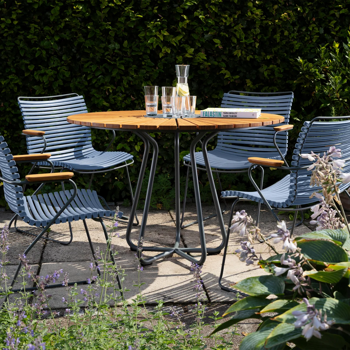 De CIRCLE buitentafel van HOUE wordt gekenmerkt door zijn harmonieuze, ronde ontwerp, dat gezelligheid en stijlvolle elegantie perfect combineert. Het tafelblad van hoogwaardig bamboe geeft de tafel een warme, natuurlijke uitstraling en maakt indruk door zijn duurzaamheid. Bamboe is een bijzonder slijtvast en onderhoudsvriendelijk materiaal, ideaal voor buitengebruik. Het opvallende, radiale ontwerp van het tafelblad benadrukt de unieke esthetiek van de tafel en zorgt ook voor stabiliteit. De constructie wordt ondersteund door een robuust frame van gepoedercoat metaal, dat de tafel een moderne, eigentijdse uitstraling geeft. De CIRCLE buitentafel biedt veel ruimte voor gezellig samenzijn buiten en past harmonieus in verschillende tuin- en terrasontwerpen.