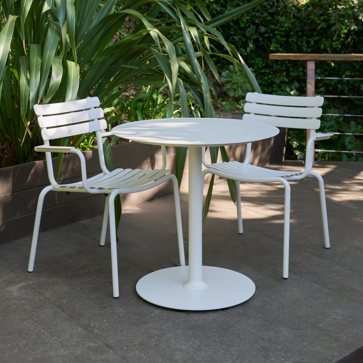 De Pico tuintafel van HOUE combineert strakke lijnen met een functioneel ontwerp en is ideaal voor kleine buitenruimtes zoals balkons, patio's of compacte zitgroepen in de tuin. Het ronde tafelblad met een diameter van 74 cm biedt plaats aan twee tot vier personen en is gemaakt van gepoedercoat metaal - weerbestendig, gemakkelijk schoon te maken en duurzaam. Het grafisch gevormde onderstel zorgt voor stabiliteit en geeft de tafel een moderne, Scandinavisch geïnspireerde esthetiek.