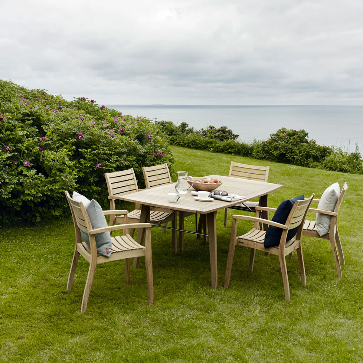 De Ballare tafel van Skagerak is een stijlvolle tuintafel van teakhout, die overtuigt door zowel design als functionaliteit. Het minimalistische ontwerp van de eettafel past perfect in de tuin of op het balkon en kan worden gecombineerd met de bijpassende stoelen om een uitnodigende zithoek te creëren. Ballare stoelen om een uitnodigende zithoek te creëren.