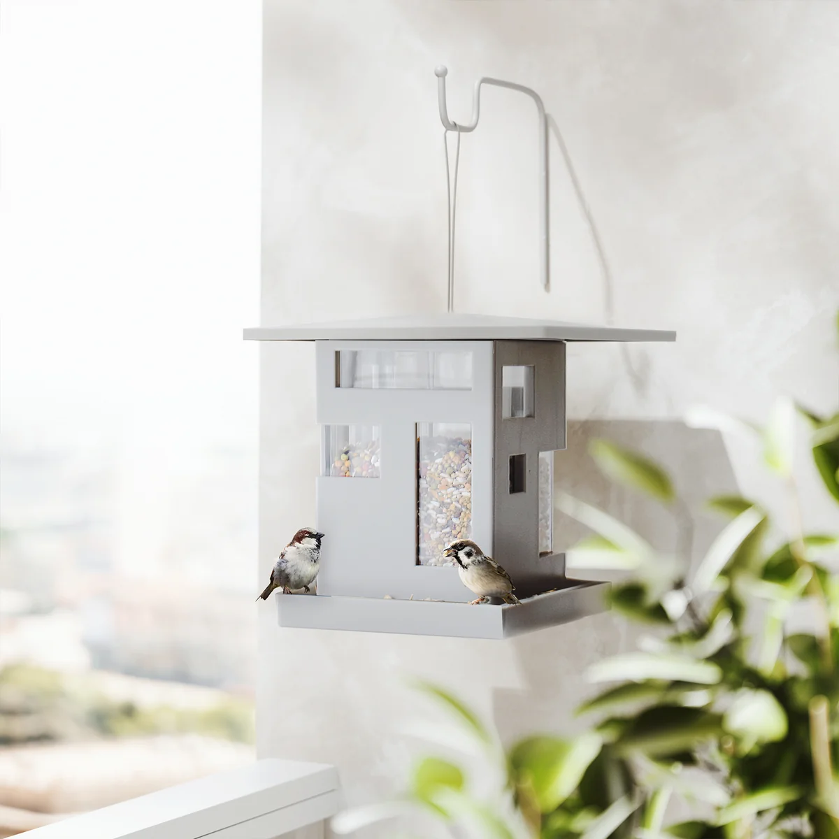 Vogels kunnen zich hier thuis voelen: De Bird Café vogelvoederhuisje van Umbra biedt plaats voor veel voedsel in een huiselijke sfeer.