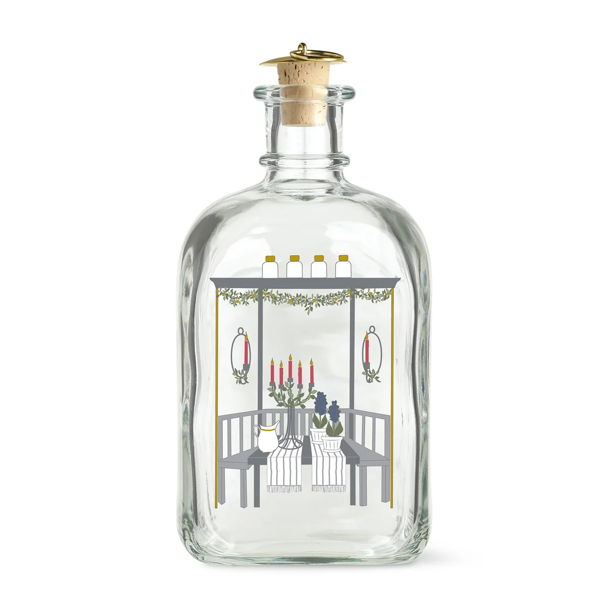 De kerstfles is gemaakt van geblazen glas en wordt handig afgesloten met een kurken deksel.