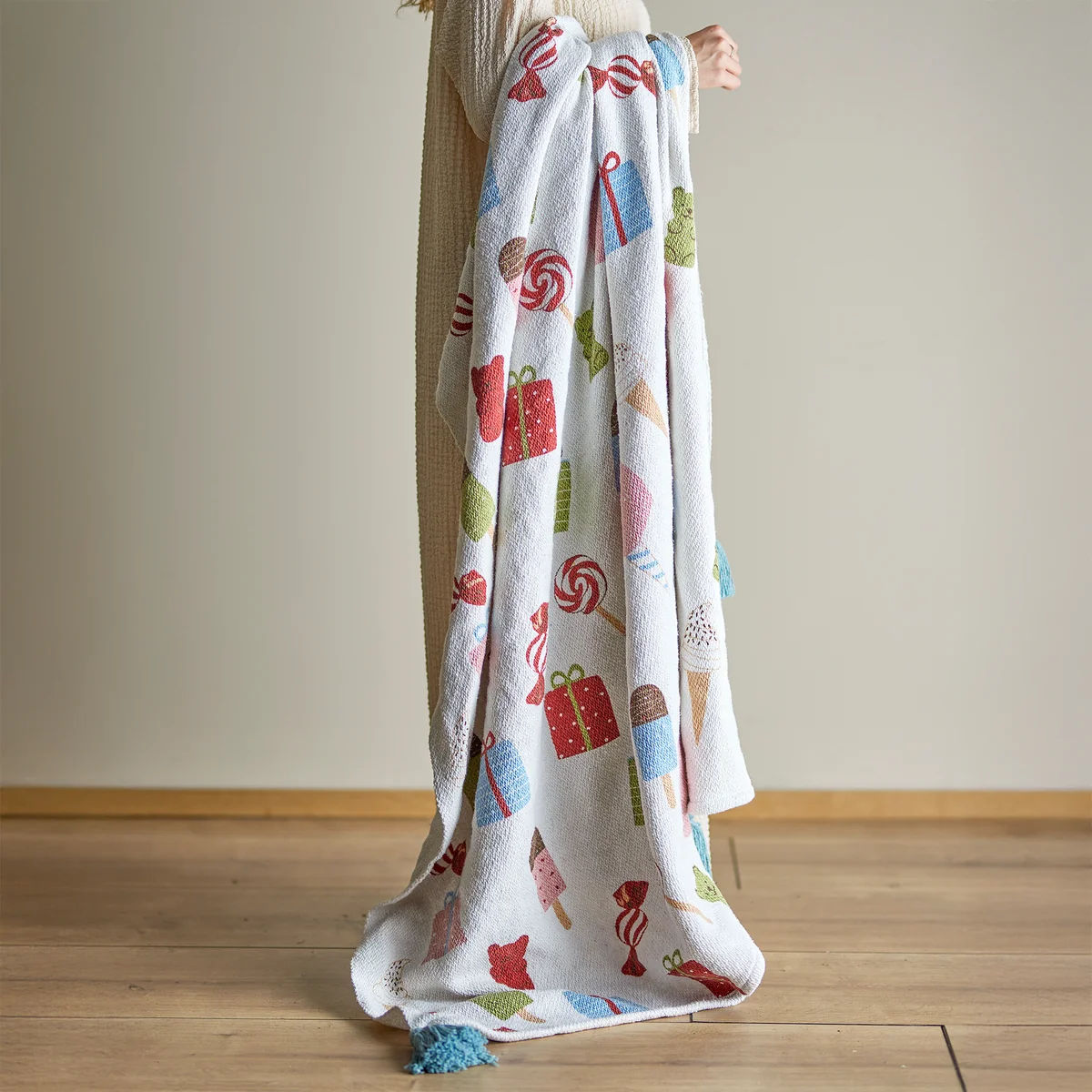 De Sweets Bloomingville deken van Mini is een feestelijke blikvanger in de kinderkamer. Deze knusse deken is gemaakt van gerecycled katoen en combineert duurzaam comfort met een speels ontwerp waar kinderharten sneller van gaan kloppen. Liefdevol ontworpen illustraties van cadeautjes, snoepjes en ijsjes roepen een zomerse sfeer op en nodigen kinderen uit om fantasierijke avonturen te beleven. Decoratieve kwastjes op elke hoek geven een charmant accent aan de deken en maken het vrolijke geheel af. Als knusse warme deken of als sfeervol decoratief element - de Sweets de deken creëert een vrolijke en uitnodigende sfeer in elke kinderkamer.