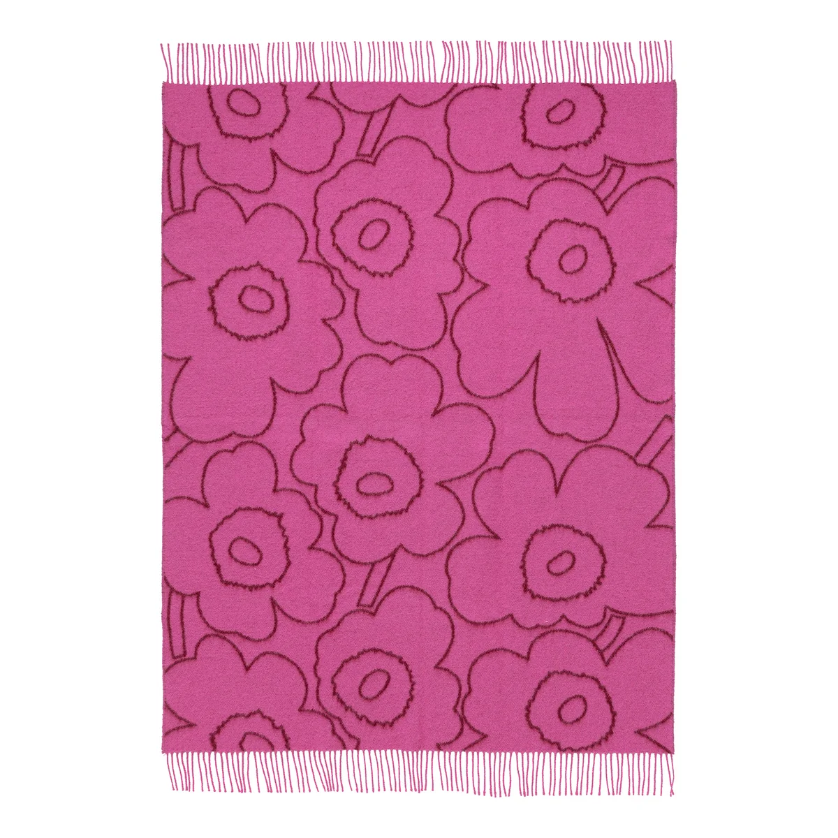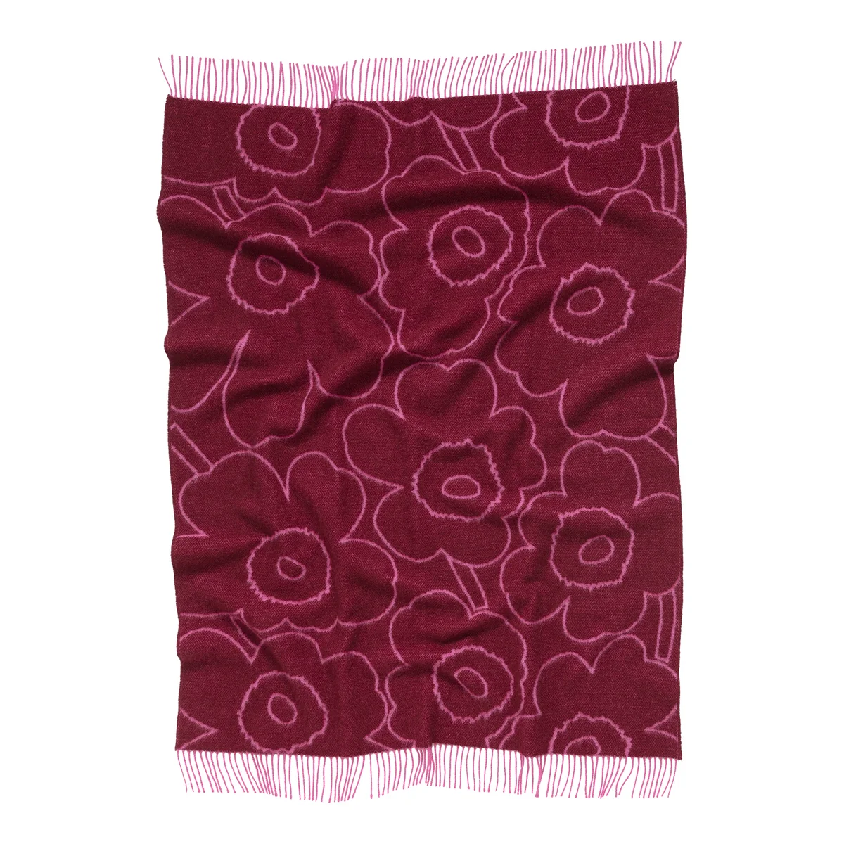 Het geweven jacquardpatroon toont een gereduceerde interpretatie van het Unikko bloemmotief - ontworpen door Maija Isola in 1964 - hier in de gestileerde, grafisch geaccentueerde Piirto Unikko versie. Franjes aan de uiteinden ronden het ontwerp af. De deken is geschikt als decoratieve woontextiel en als verwarmende aanvulling op de bank of het bed.
