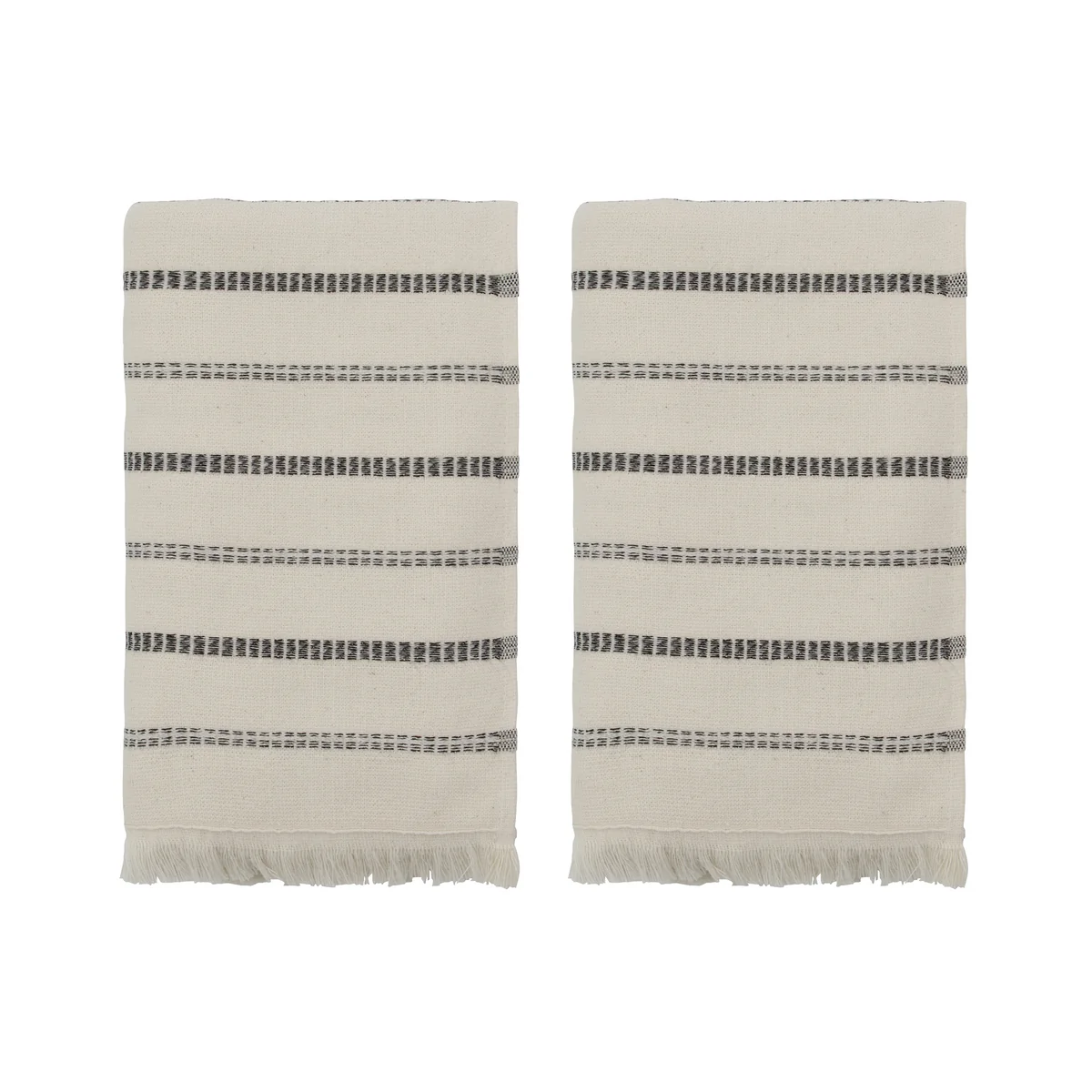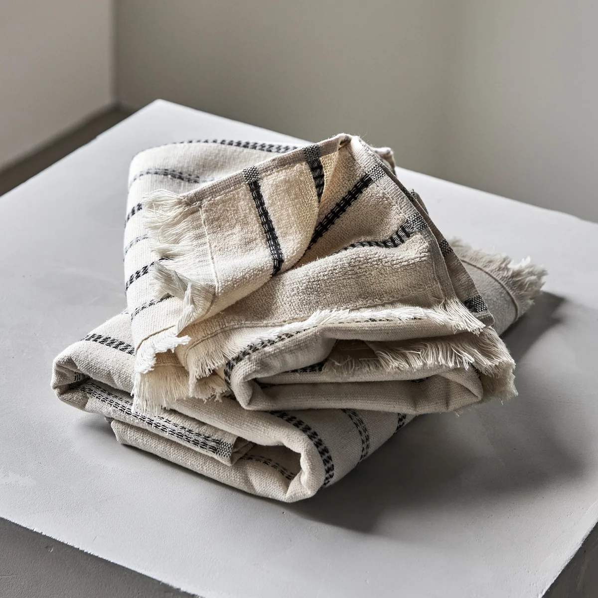 De True handdoek van Meraki brengt een luxe spa-sfeer in je badkamer. Hij is gemaakt van een zachte, OEKO-TEX-gecertificeerde katoenmix en verwent je huid met maximaal comfort. Het subtiele gestreepte patroon geeft de handdoek een tijdloze, elegante uitstraling, terwijl de met de hand bewerkte franjes de look afmaken en doen denken aan traditioneel hammamtextiel. Ideaal voor dagelijks gebruik of als stijlvol accessoire voor gasten.