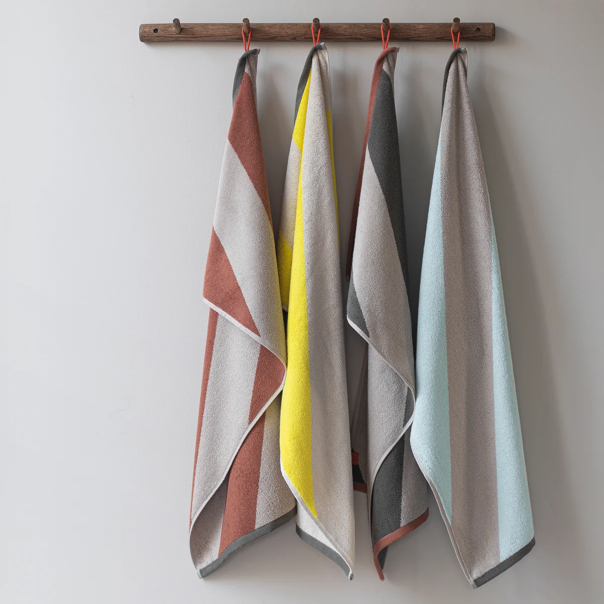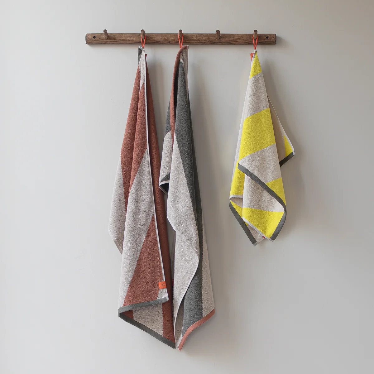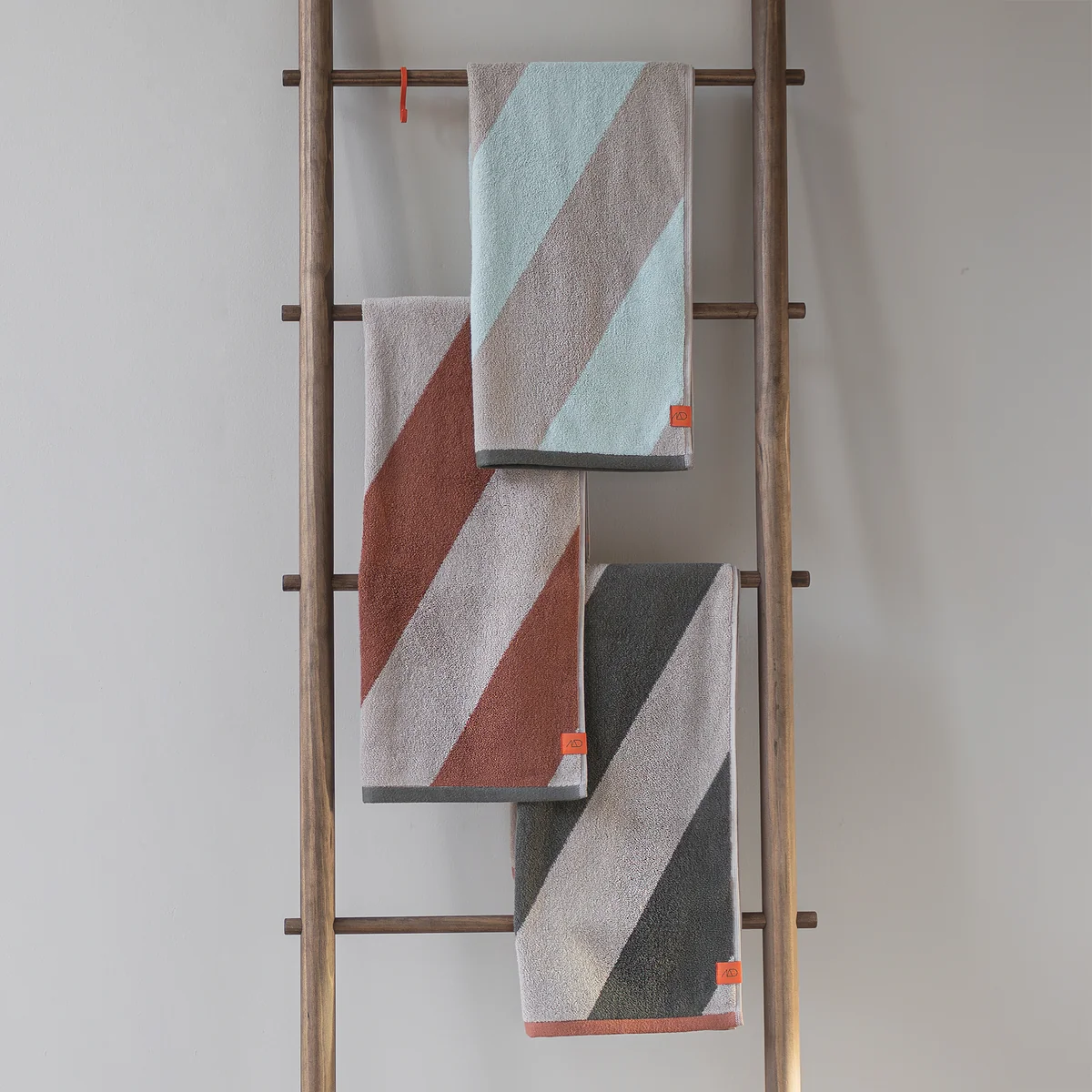 Diagonal Mette Ditmer De handdoek van voegt een stijlvol accent toe aan de badkamer. Diagonale strepen in warme kleuren voegen warmte en karakter toe, terwijl de rand een geraffineerd contrast creëert. De oranjekleurige lus dient als praktisch en decoratief detail en vult het moderne ontwerp aan.