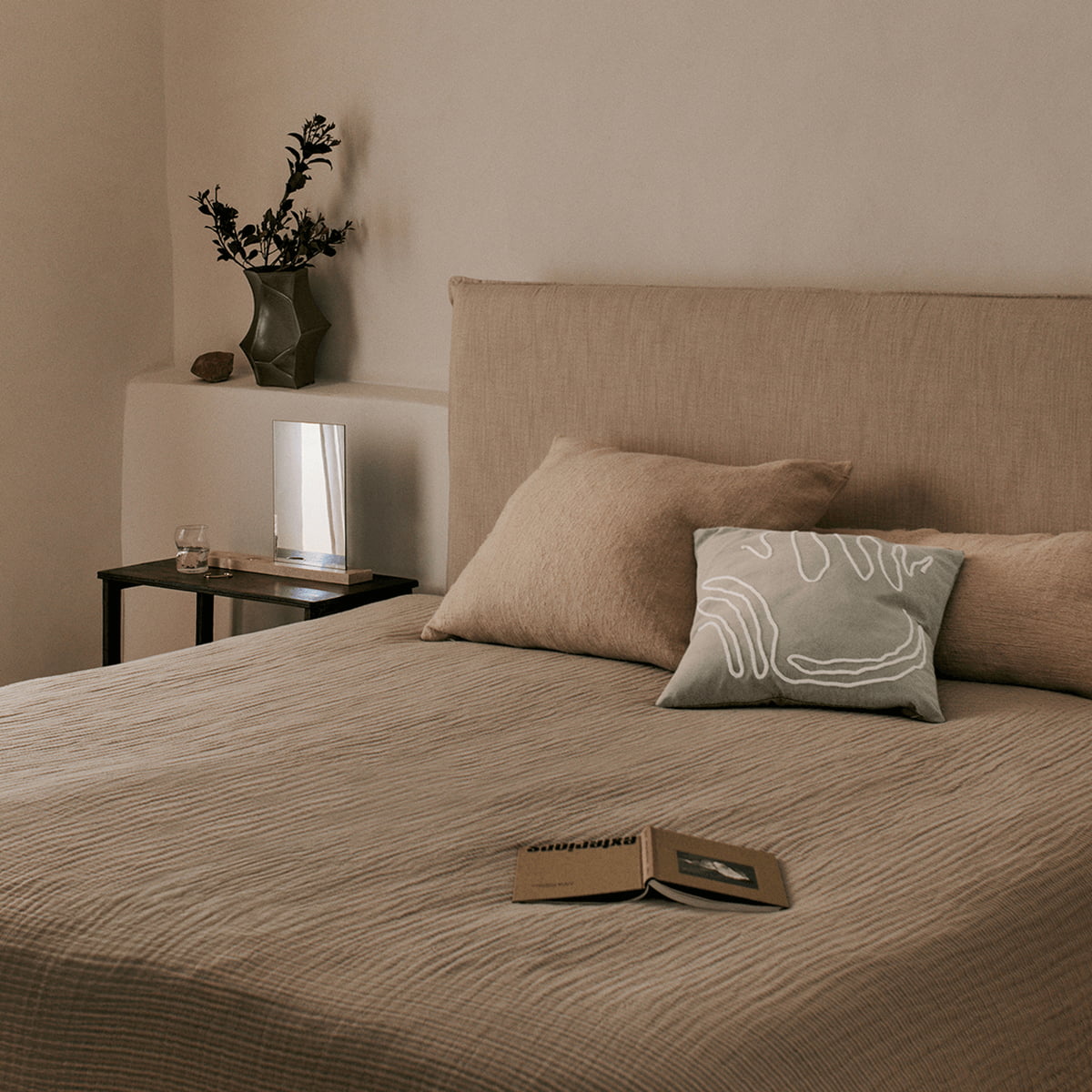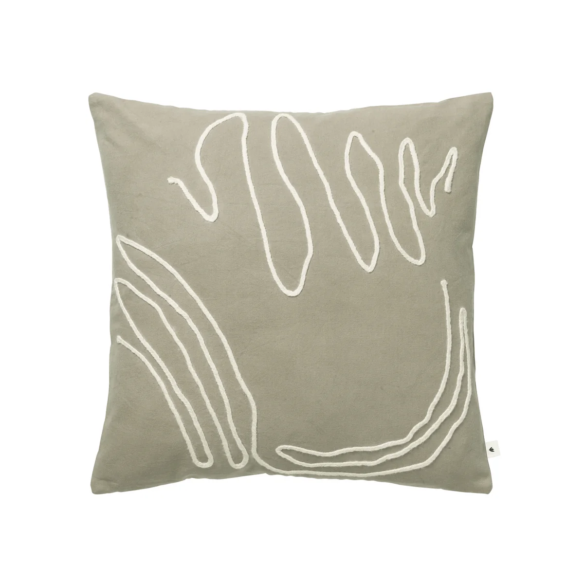 Het Jot kussen, gemaakt van 100% GOTS-gecertificeerd katoen, weerspiegelt de zachte sporen van waterstromen en kustlandschappen. Het handgemaakte contrastrijke katoenweefsel is vakkundig geborduurd op een katoenen canvas met textuur, waardoor het ontwerp een voelbare diepte krijgt.