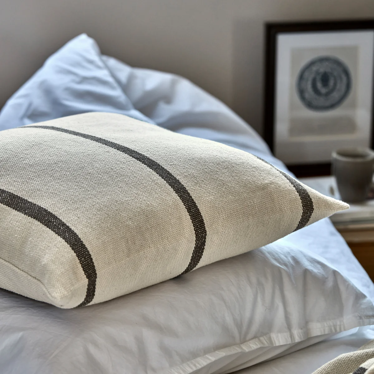 De Nula kussenhoes brengt modern design en comfort in de woonkamer. Hij is gemaakt van zacht katoen en maakt indruk met zijn eenvoudige elegantie en ingeweven donkerbruine strepen. Het tijdloze ontwerp maakt het een veelzijdig accessoire dat perfect gecombineerd kan worden met verschillende inrichtingsstijlen. Op de bank, het bed of de fauteuil - de Nula kussenhoes plaatst elegante accenten en creëert een gezellige sfeer.
