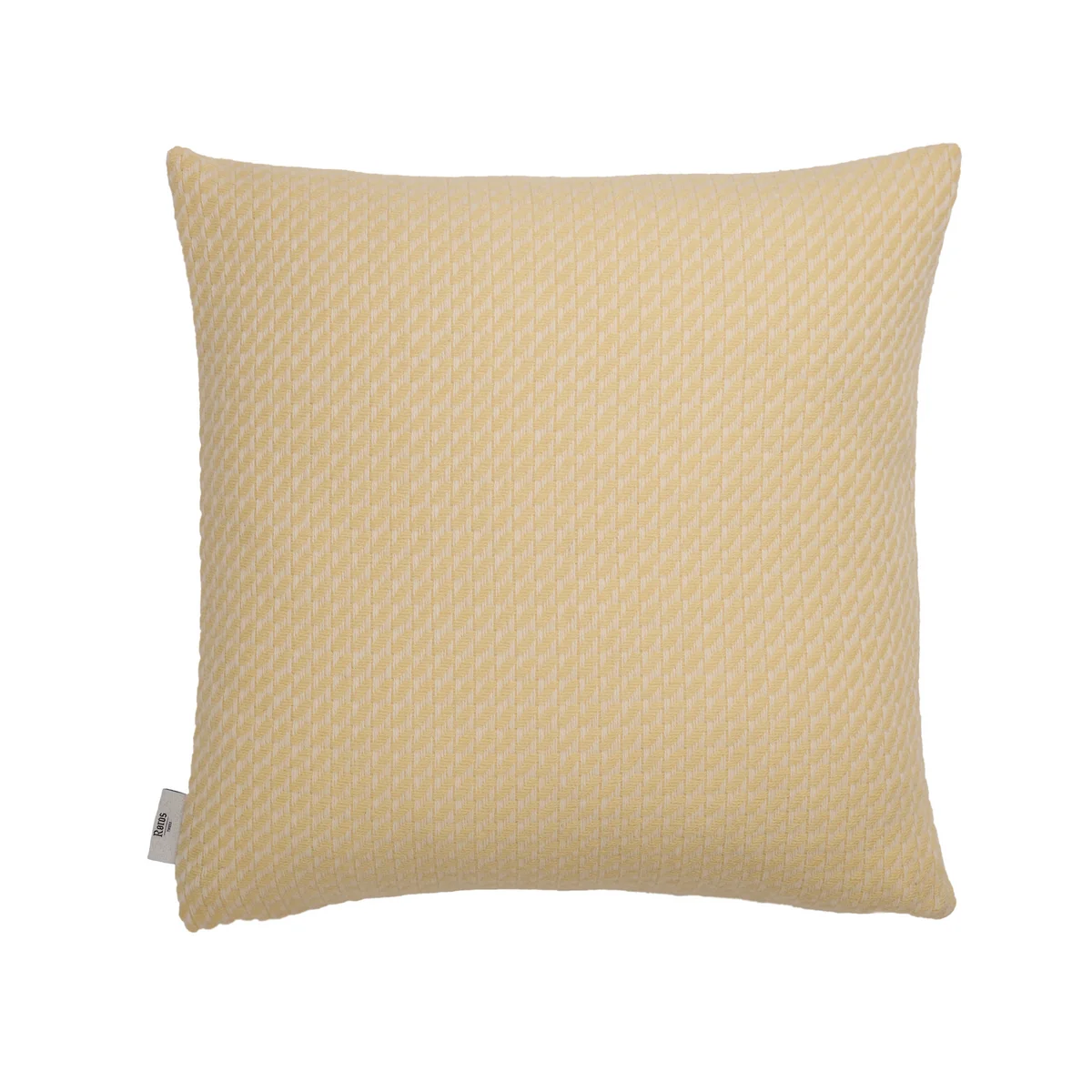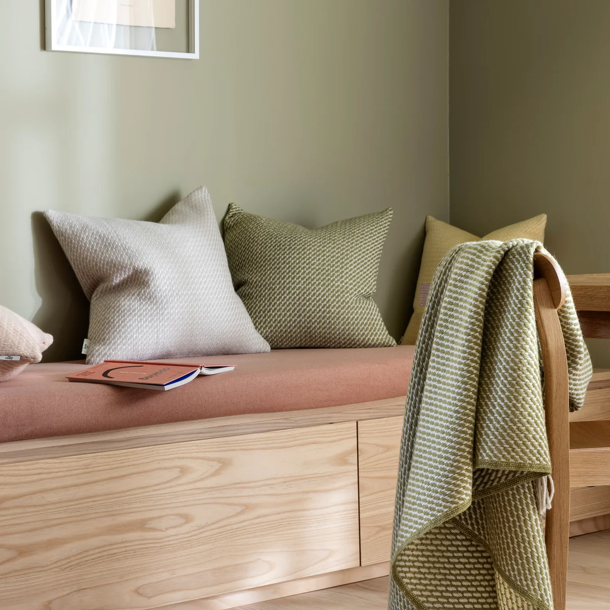 Het Mello kussen van Skogstad & Wærnes voor Røros Tweed. Het ontwerp dat vorig seizoen werd geïntroduceerd Mello -ontwerp dat vorig seizoen werd geïntroduceerd, wordt nu uitgebreid met een serie kussens die verkrijgbaar zijn in dezelfde kleuren als de bestaande plaids. Skogstad & Wærnes experimenteerde met garen en papier om een diagonaal patroon te creëren. Het resultaat is een structureel veerkrachtige constructie die de stof een driedimensionale textuur geeft.