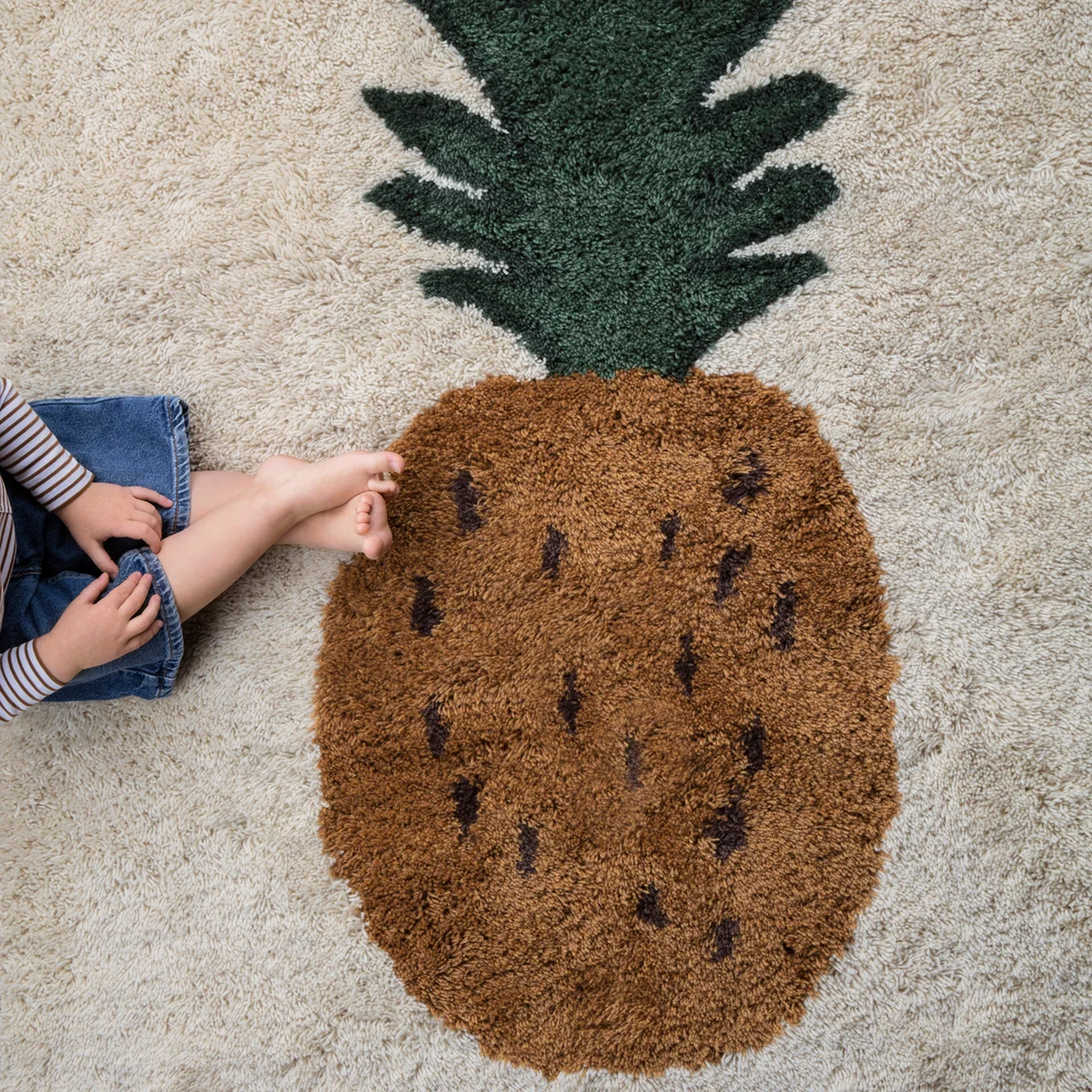 Het Fruiticana tapijt van de Deense fabrikant Ferm Living is een zacht, hoogpolig tapijt met een speels ananassig motief dat vooral in de kinderkamer kan worden gebruikt: Of het nu gaat om een aangenaam vloeroppervlak, een decoratief object of een speeltuin.