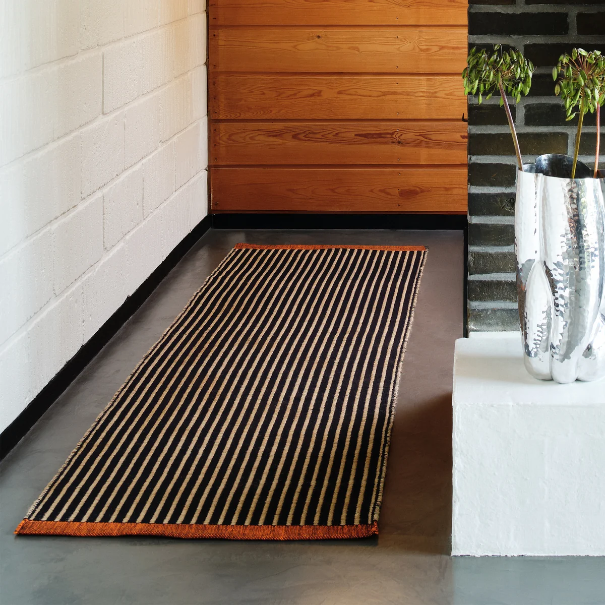 De Line tapijtloper combineert functioneel design met nauwkeurig vakmanschap. Het tapijt is gemaakt van een natuurlijke jutemix met een vlakke weeftechniek die aan beide zijden kan worden gebruikt en maakt indruk met zijn opvallende lijnen. De oranje geweven band zorgt voor een gericht kleuraccent, terwijl de zwarte strepen het ontwerp een dynamische structuur geven. Het tapijt is verkrijgbaar in drie verschillende maten en kan flexibel worden geïntegreerd in verschillende ruimteconcepten - van een subtiel accent tot een expressief middelpunt.