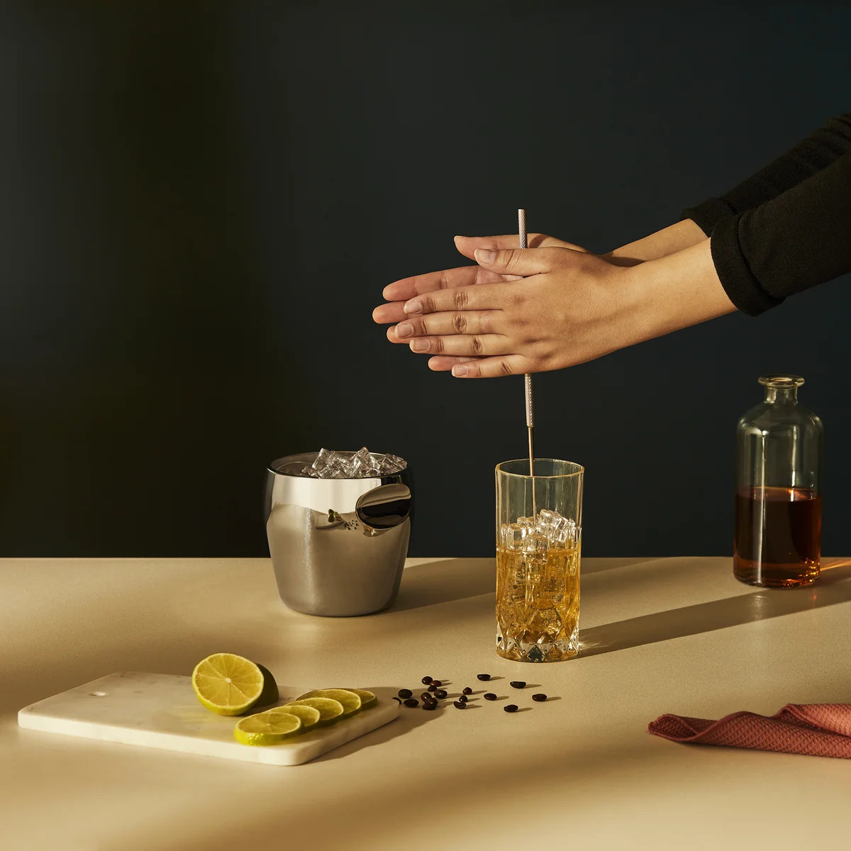 The Tending Box beschrijft een verfijnde en moderne collectie bargerei voor het bereiden van cocktails. Ontworpen door Giulio Iacchetti en mixoloog Oscar Quagliarini, gaat de industriële roestvrijstalen look van het gereedschap samen met de meest functionele, technische bruikbaarheid.