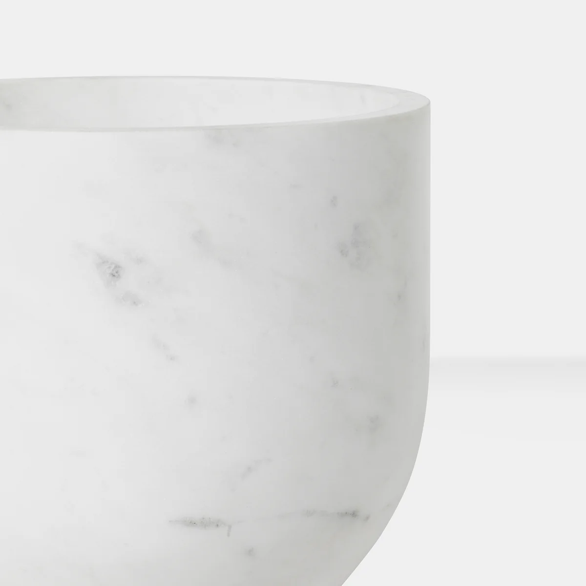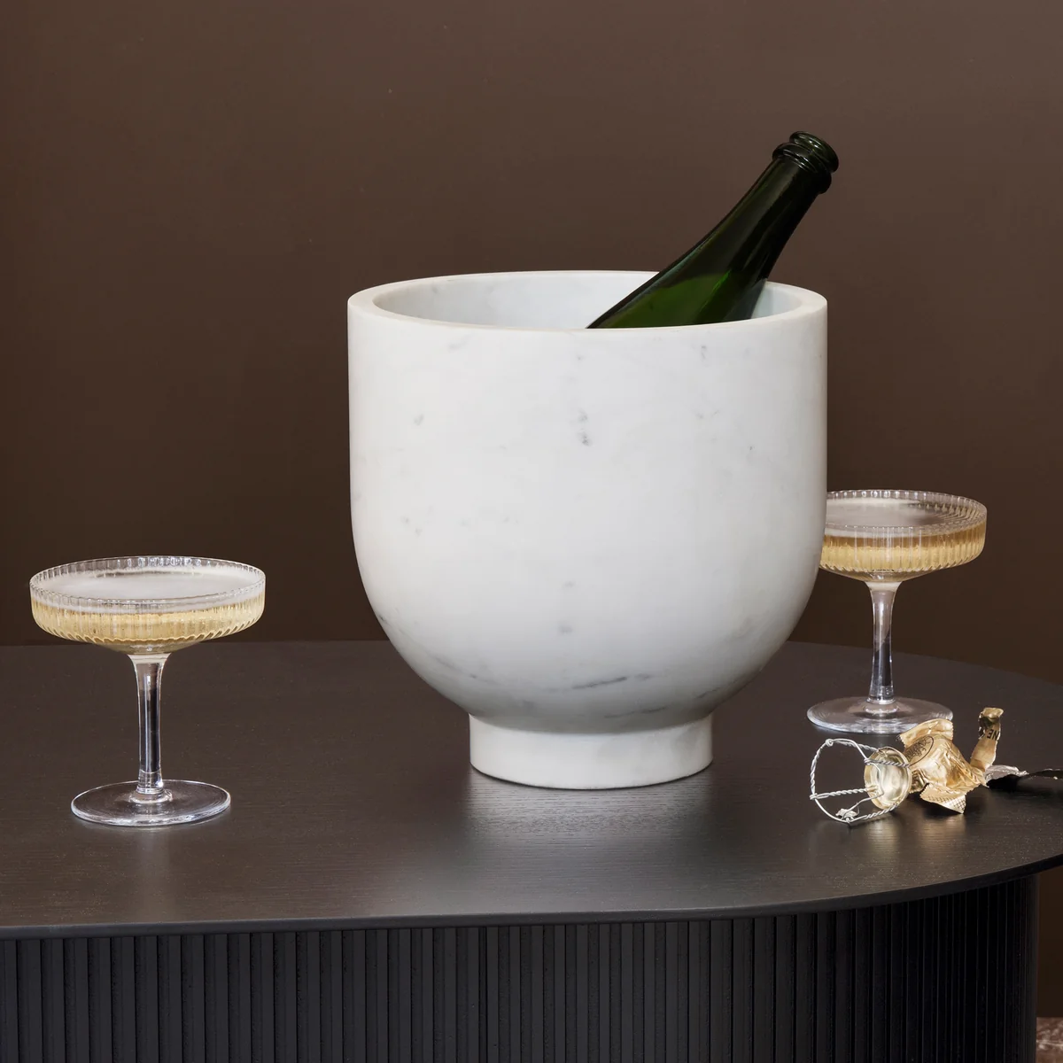 De champagnekoeler is gemaakt van wit Banswara-marmer uit India. De fijne korrel van het marmer varieert van koeler tot koeler, waardoor elke Alza champagnekoeler uniek is.