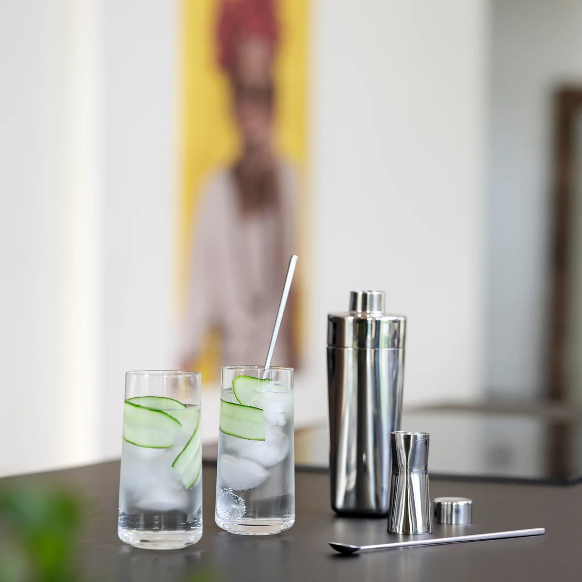 Zone Denmark De Rocks barset van, een verfijnde toevoeging aan de bar thuis. Deze set bestaat uit een shaker, een jigger en een cocktaillepel, allemaal zorgvuldig gemaakt van gepolijst staal.