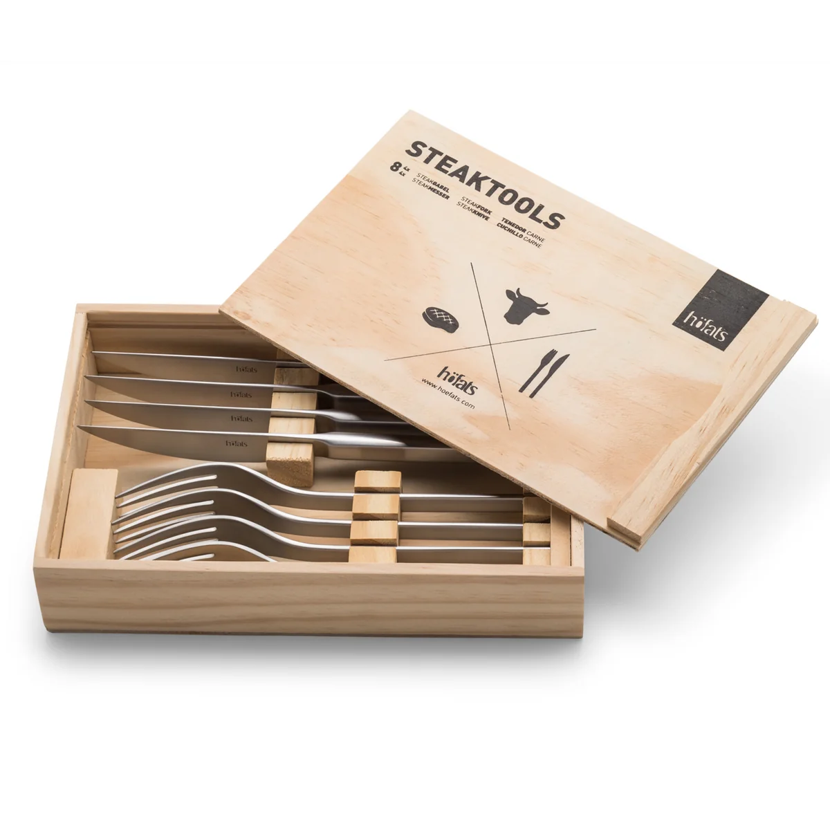 Het steakbestek van höfats is een uitstekend cadeau voor vleesliefhebbers en een must-have voor iedereen die van lekker eten houdt. Het door höfats ingestelde steakbestek bestaat uit vier vorken en messen, met messen die zo scherp zijn dat ze gemakkelijk door het vlees snijden. De biefstuk blijft dus sappig en behoudt zijn fijne smaak. Bovendien zijn de gebruiksvoorwerpen niet alleen geschikt voor vlees, maar ook om pizza's in hapklare porties te snijden.