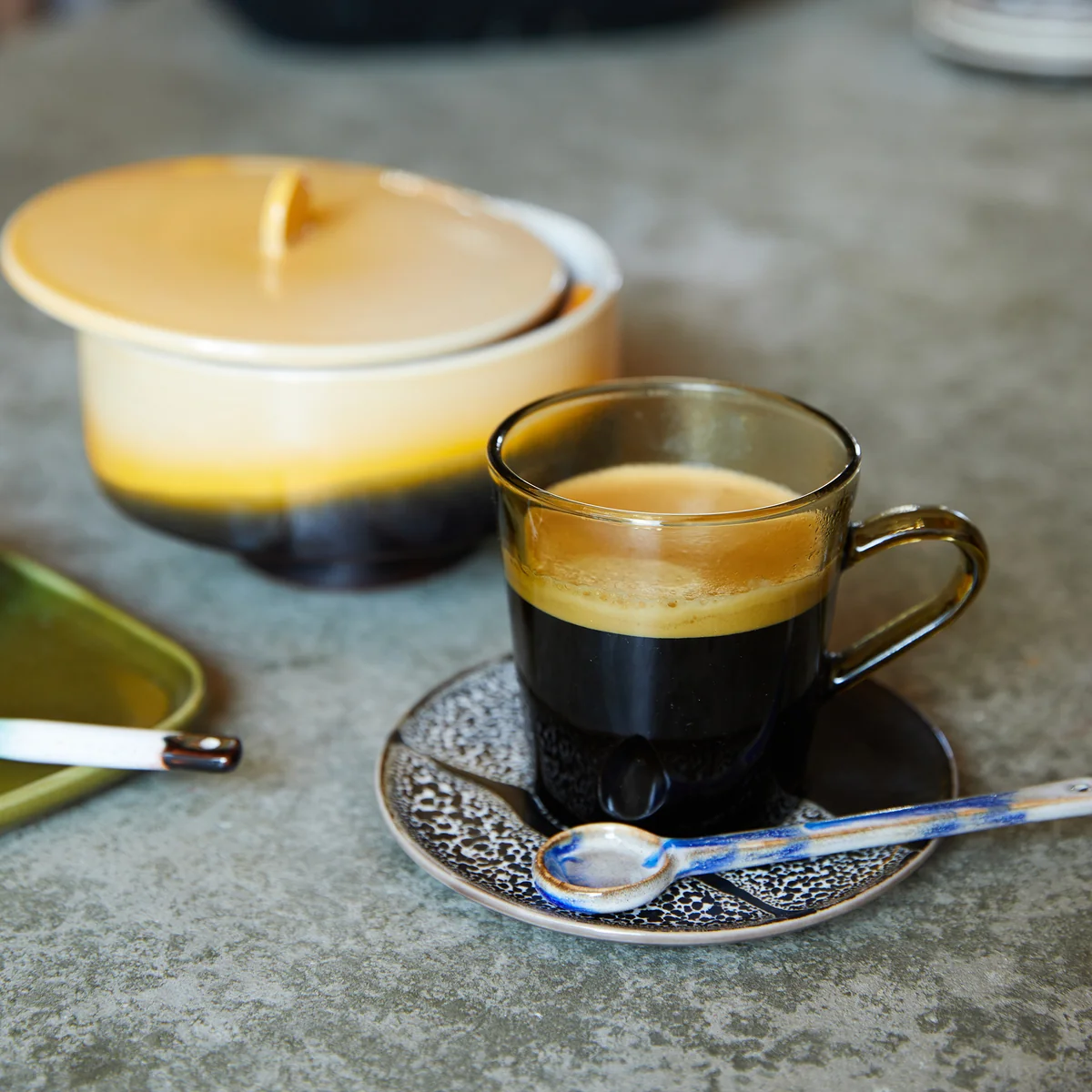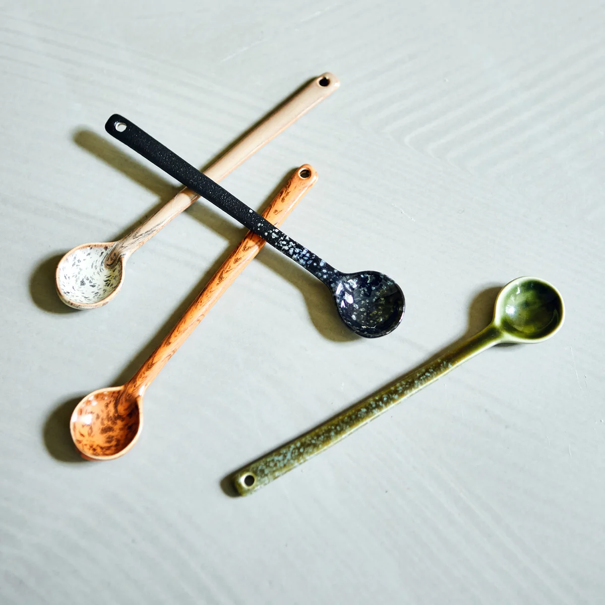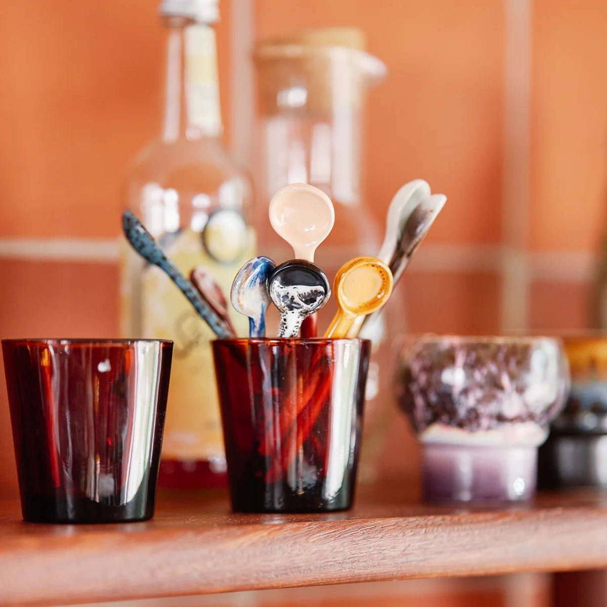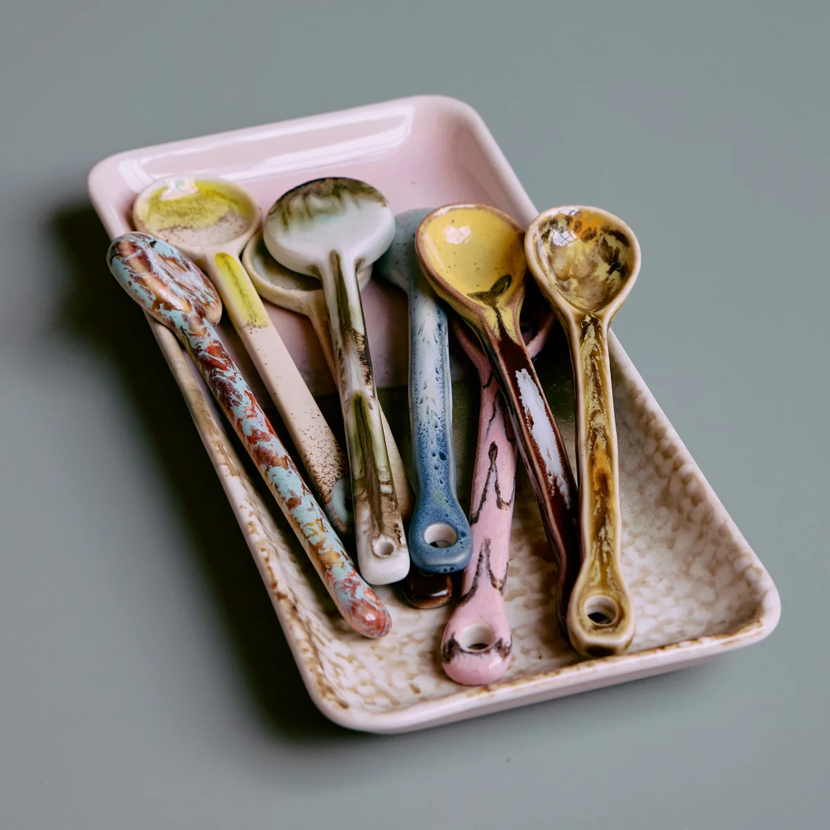 De op keramiek gebaseerde 70's collectie van HKliving presenteert als belangrijk onderdeel: een serie verschillende kleurrijke lepels gemaakt van reactief geglazuurd steengoed. De lepels zijn ideaal voor het serveren van koffie of kleine desserts, zoals crème brûlée of rijstpudding. HKliving zorgt ervoor dat voor elke gelegenheid de juiste lepel beschikbaar is.