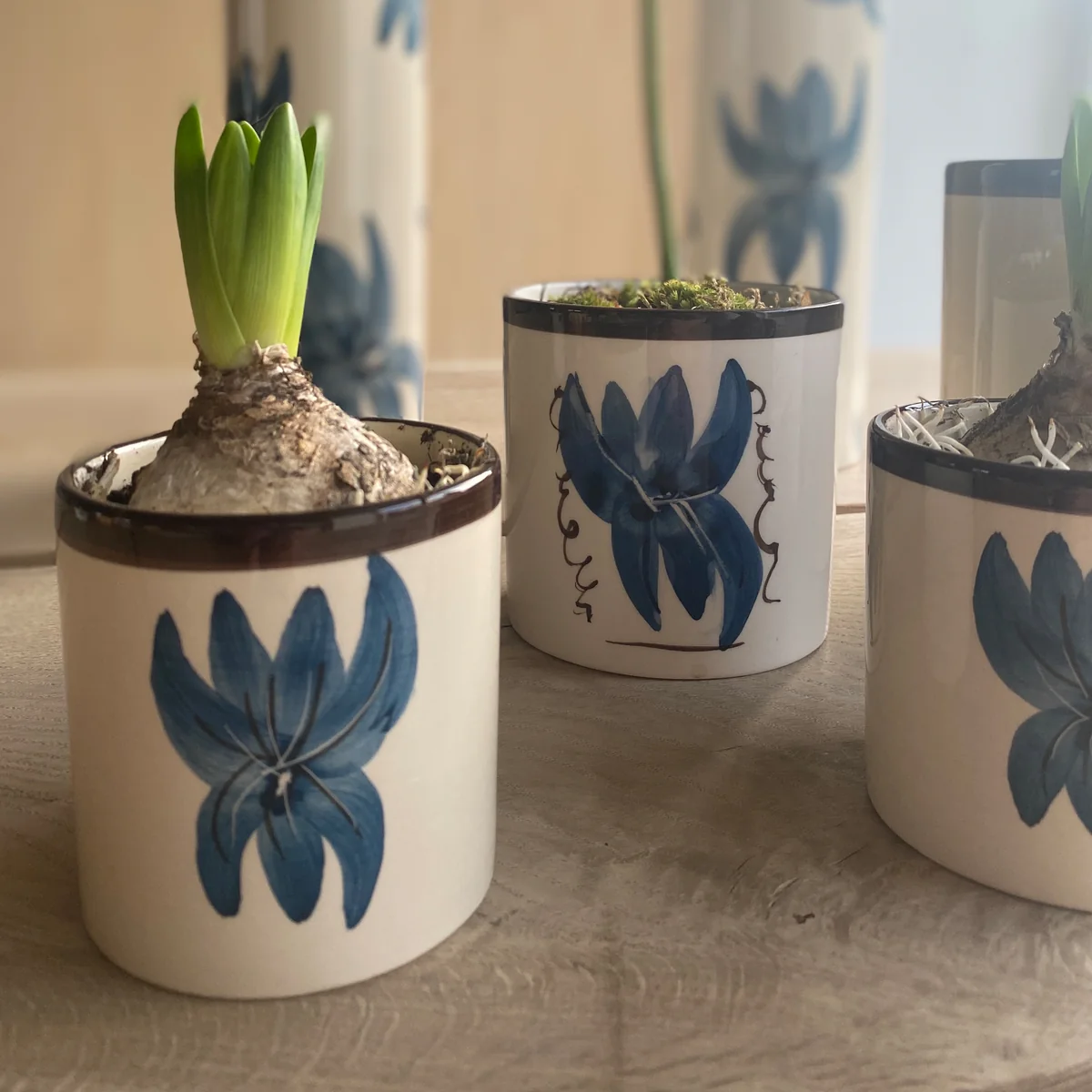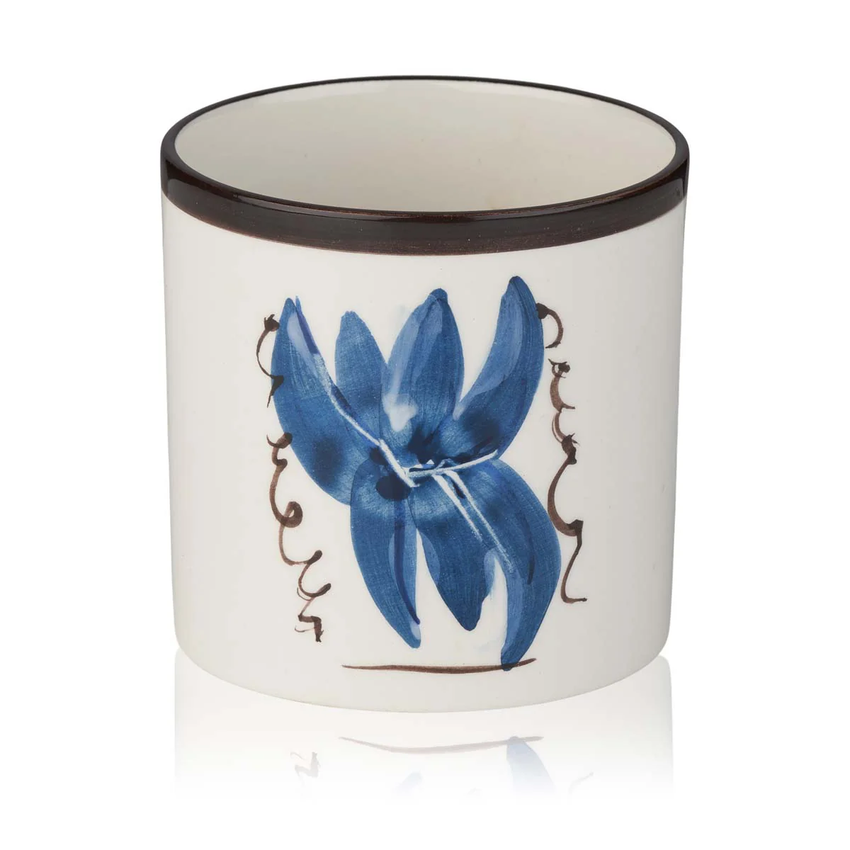 van Humdakin . De container is verkrijgbaar in verschillende maten en is goed te gebruiken als bijv. een pennenbakje. Aan de bovenkant is een donkere rand op de container geschilderd. Het blauwe bloemenpatroon, dat minimalistisch op de container is aangebracht, combineert klassiek met modern - maar altijd op een harmonieuze manier.