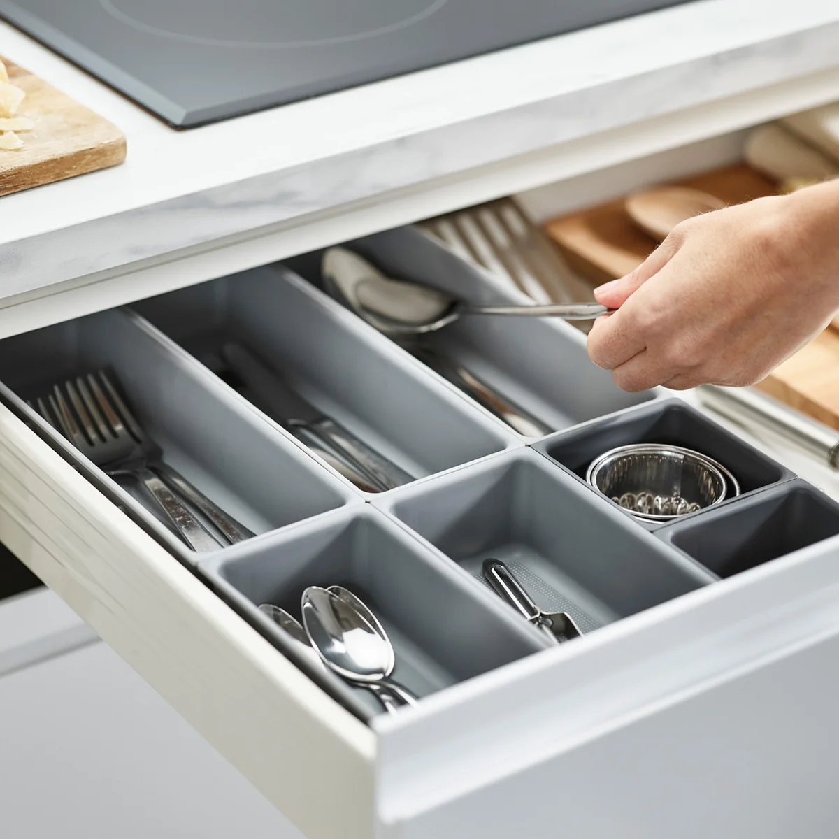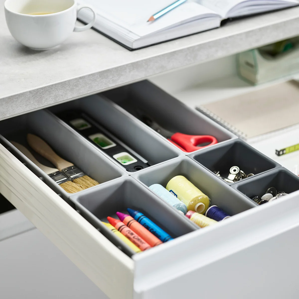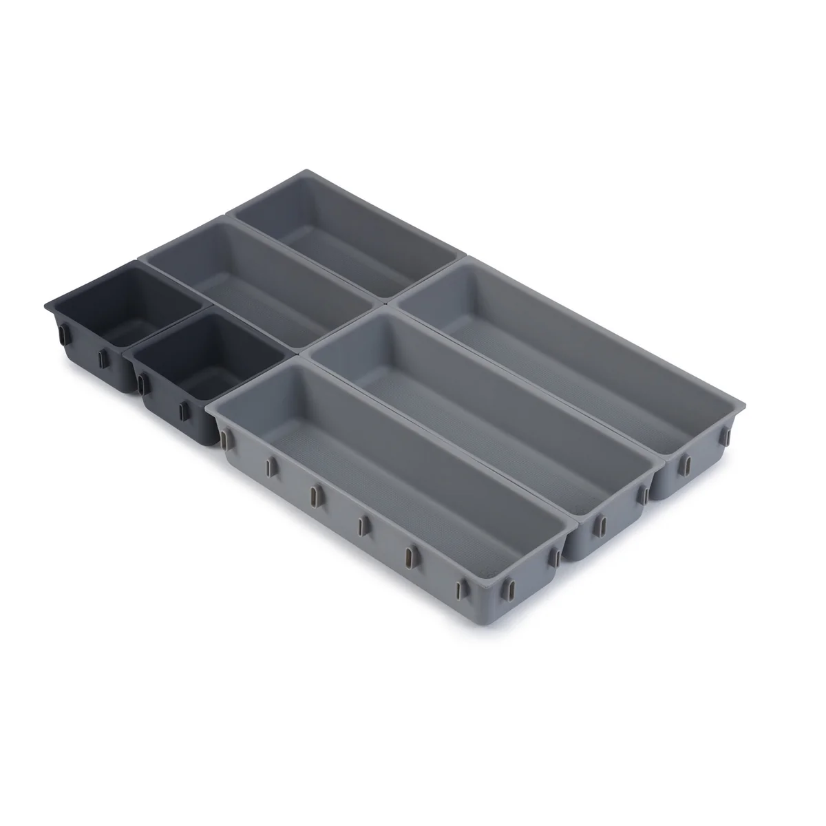 De Blox lade-organizer set van Joseph Joseph bestaat uit losse bakjes van verschillende afmetingen die rondom in elkaar gestoken kunnen worden en zo naar wens kunnen worden gerangschikt, afhankelijk van de ruimte in de lade. Natuurlijk kunnen de vakken ook worden verdeeld en in verschillende laden worden gebruikt.