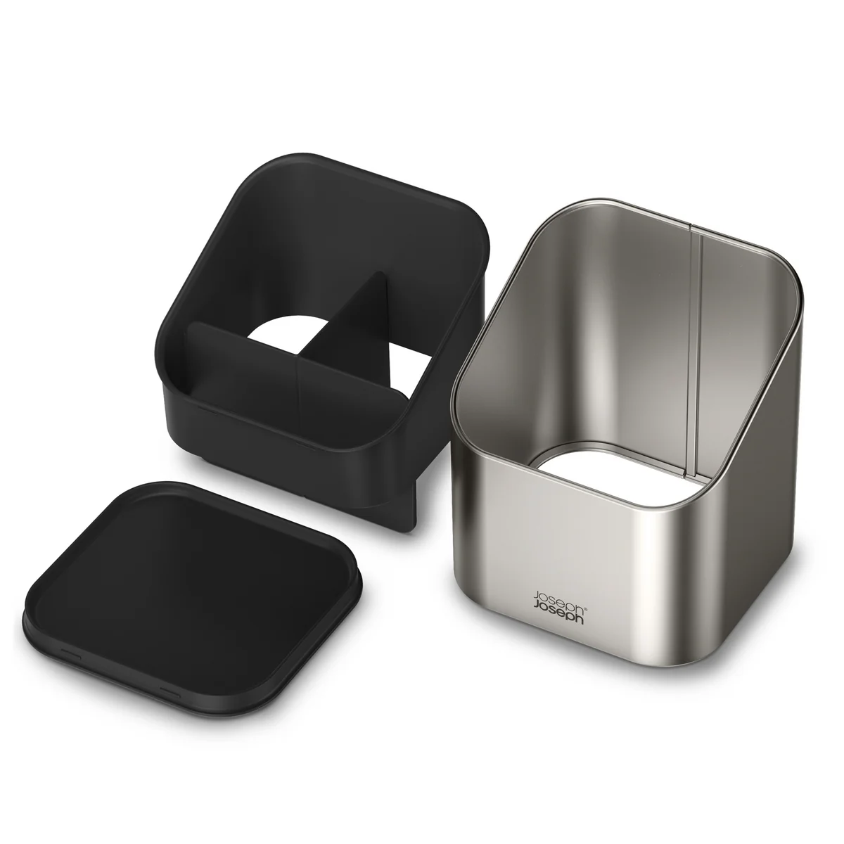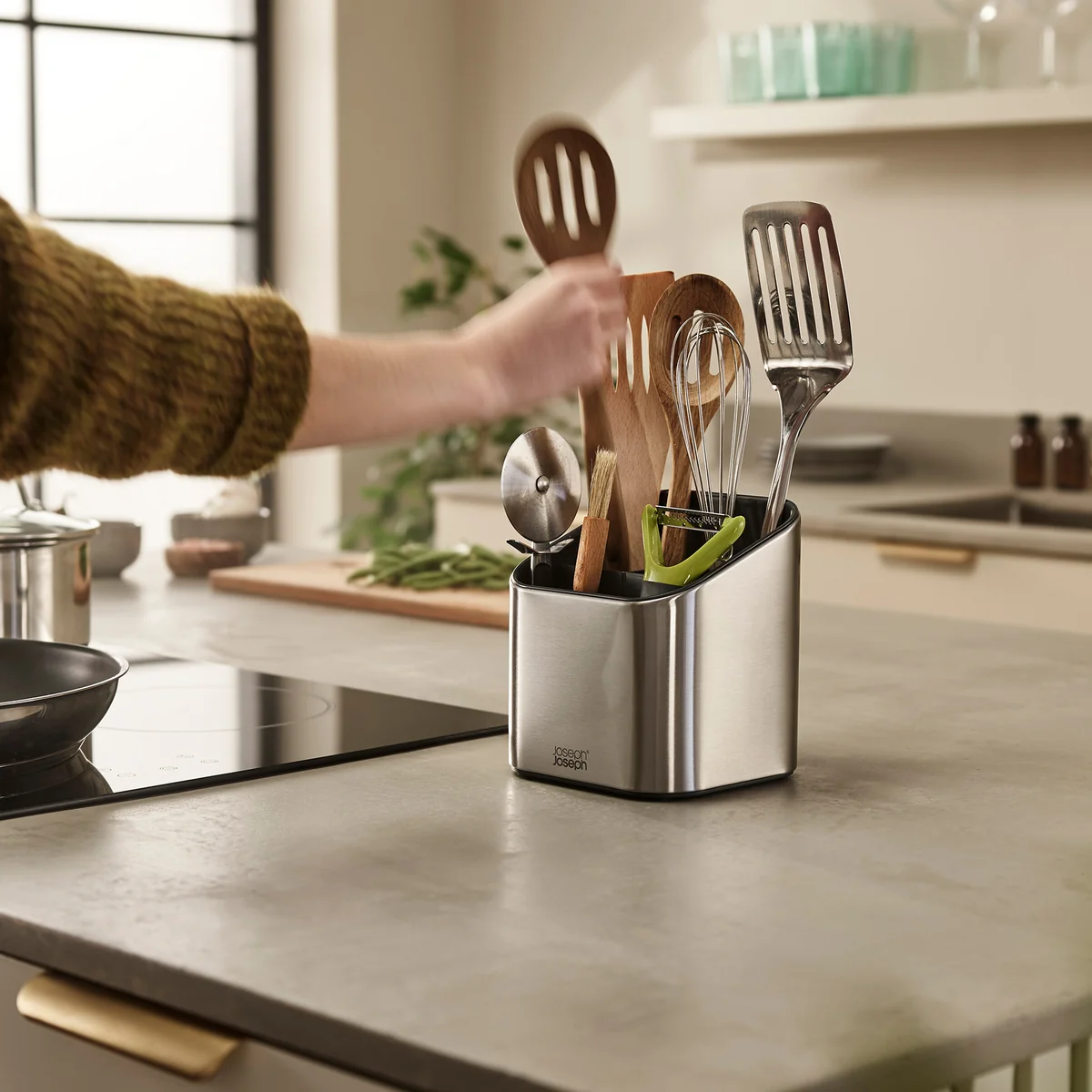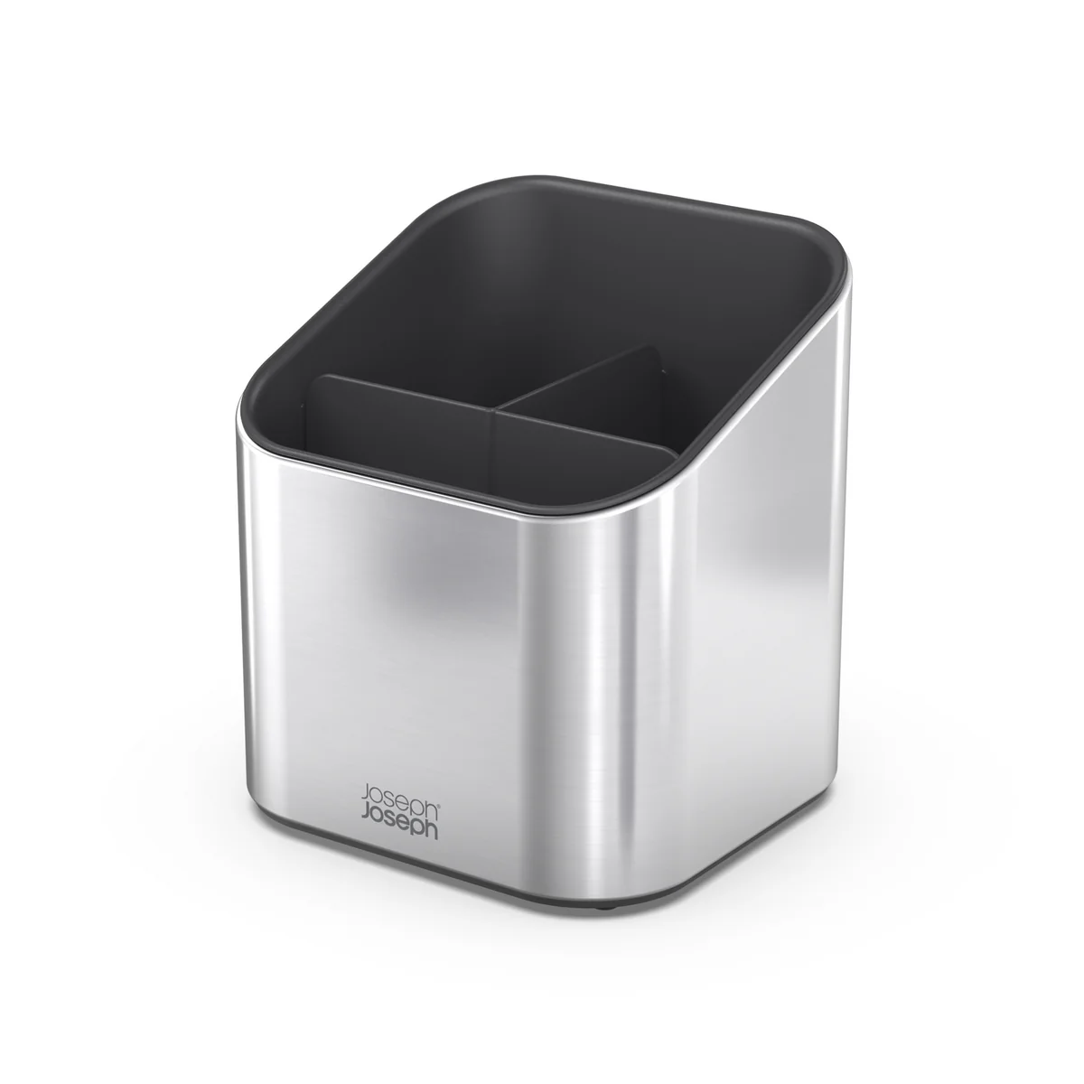 De Surface roestvrijstalen gereedschapsbakje van de Britse fabrikant Joseph Joseph kan multifunctioneel worden gebruikt in het huishouden. Allerlei keukengerei met lange handvatten of kleine keukengadgets zoals schilmesjes kunnen optimaal worden opgeborgen. Afhankelijk van persoonlijke voorkeur Surface kan ook gebruikt worden in de badkamer voor cosmetica. Dankzij het afgeschuinde ontwerp wordt de toegang vergemakkelijkt. De uiterst robuuste roestvrijstalen behuizing is vingerafdrukbestendig, heeft antislipvoetjes en kan gemakkelijk met de hand worden gedemonteerd en gereinigd.