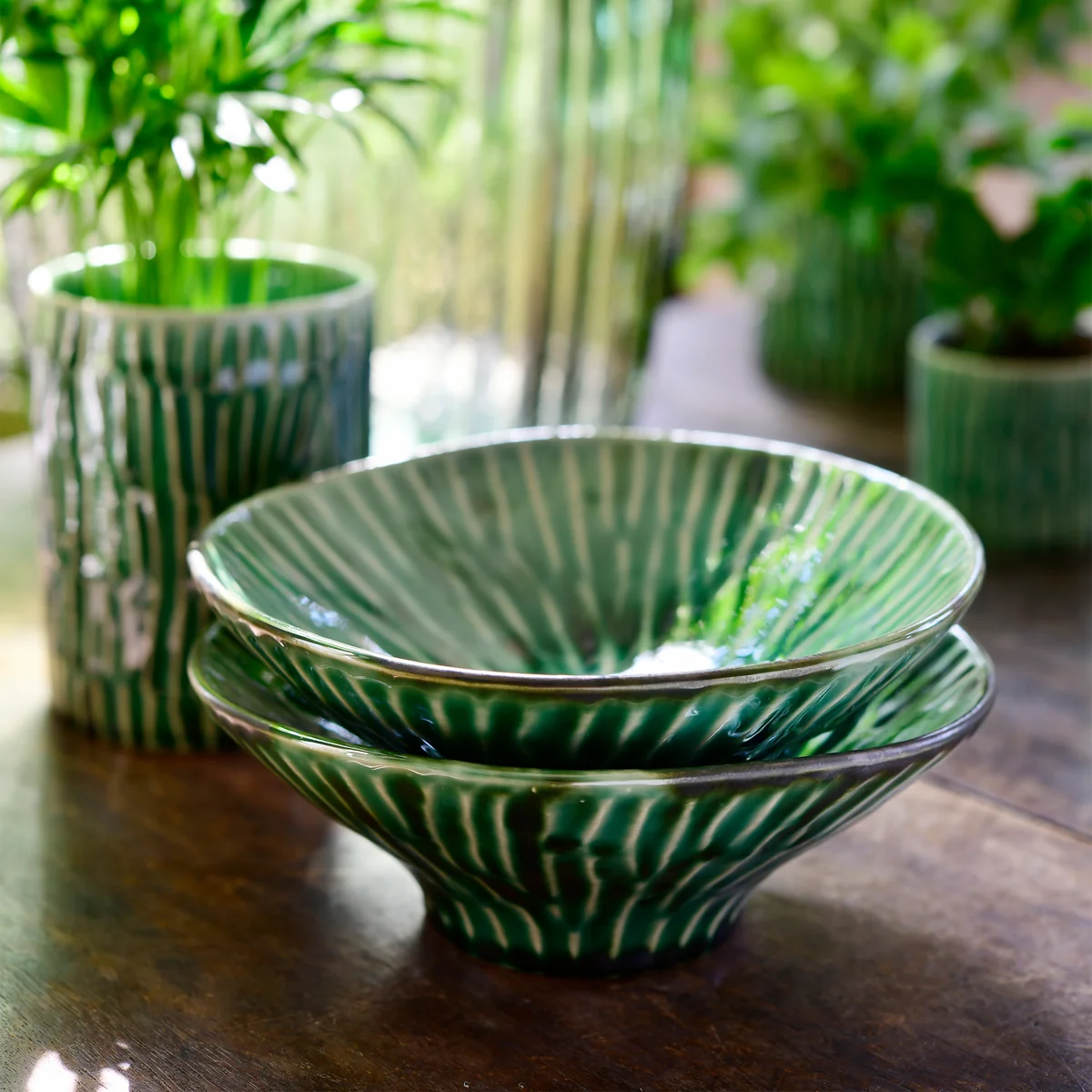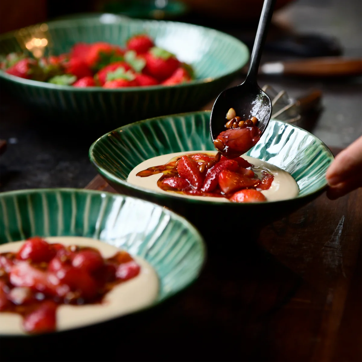 De Verde Lanza kom van Serax , ontworpen door Pascale Naessens, combineert functioneel servies met artistieke inspiratie. Het is gebaseerd op het indrukwekkende landschap van Lanzarote, waar weelderig groen wordt afgewisseld met zwart vulkanisch gesteente. De kom maakt indruk met een zongebruind glazuur in een levendige groene kleur die het beste naar boven brengt in gerechten van over de hele wereld. Het ontwerp wordt versterkt door een schelpachtige textuur, die Naessens zelf heeft ontworpen en die elke kom een karakteristieke uitstraling geeft. Perfect als stand-alone stuk of in combinatie met het bijpassende Verde Lanza bord .