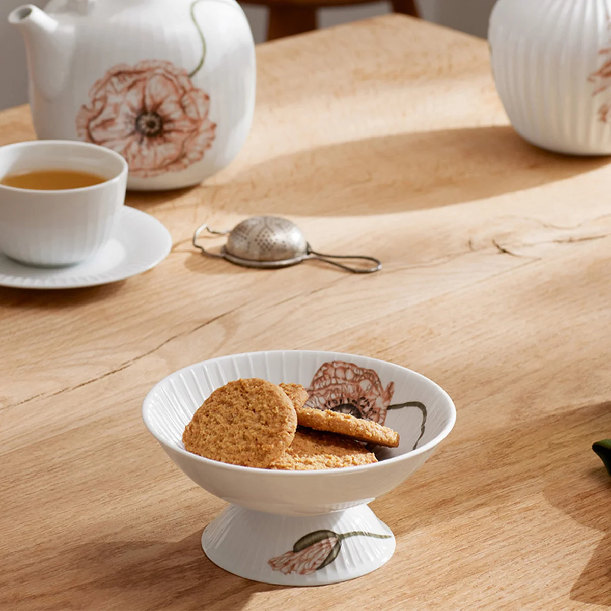 De Hammershøi Poppy kom op voet van Kähler Design wordt gekenmerkt door zijn hoge ontwerp, dat hem een unieke elegantie geeft. De kom is voorzien van een subtiel bloemendessin in zachte kleuren die de tafelsetting een stijlvolle en aangename uitstraling geven. In een geribbelde Design kan de kom worden gebruikt om gebak en hapjes op een gedistingeerde manier te serveren.