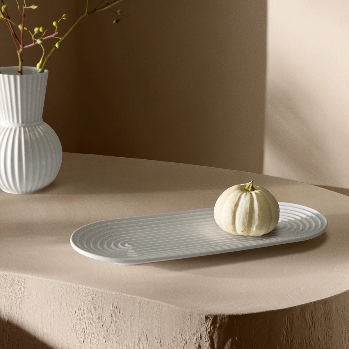 De Lyngby Tura serveerschaal van Lyngby Porcelæn combineert Scandinavische designtraditie met moderne designtaal en is een stijlvol hoogtepunt voor elke tafelsetting. Met zijn elegante, ovale silhouet is hij ideaal voor het serveren van eten en zet hij tegelijkertijd de tafel smaakvol in scène.