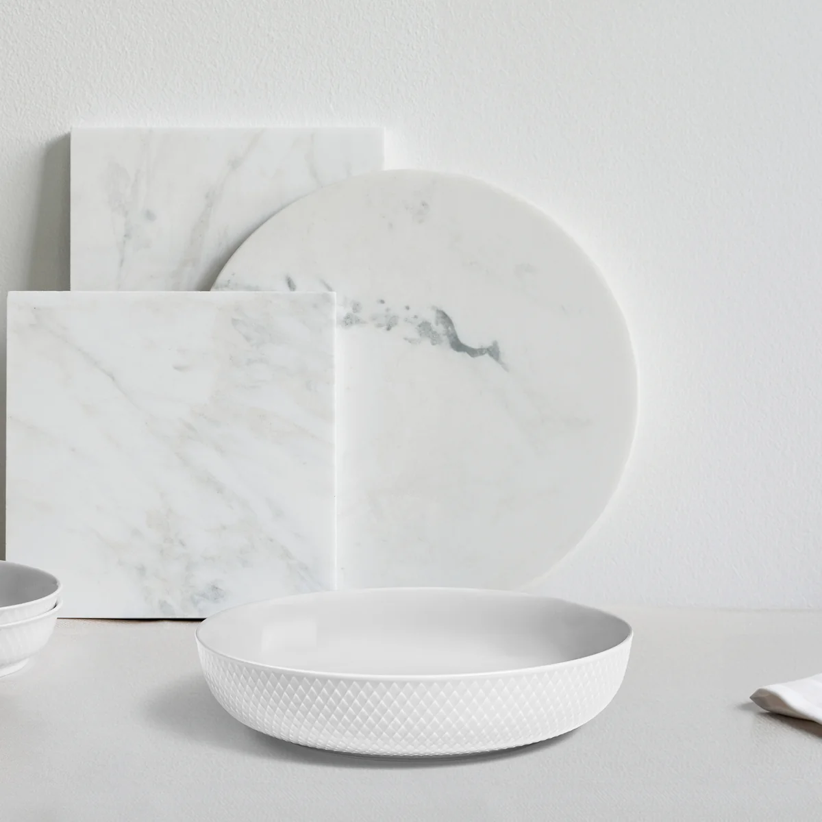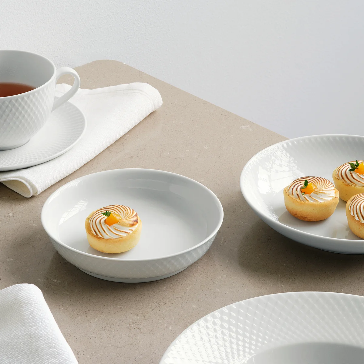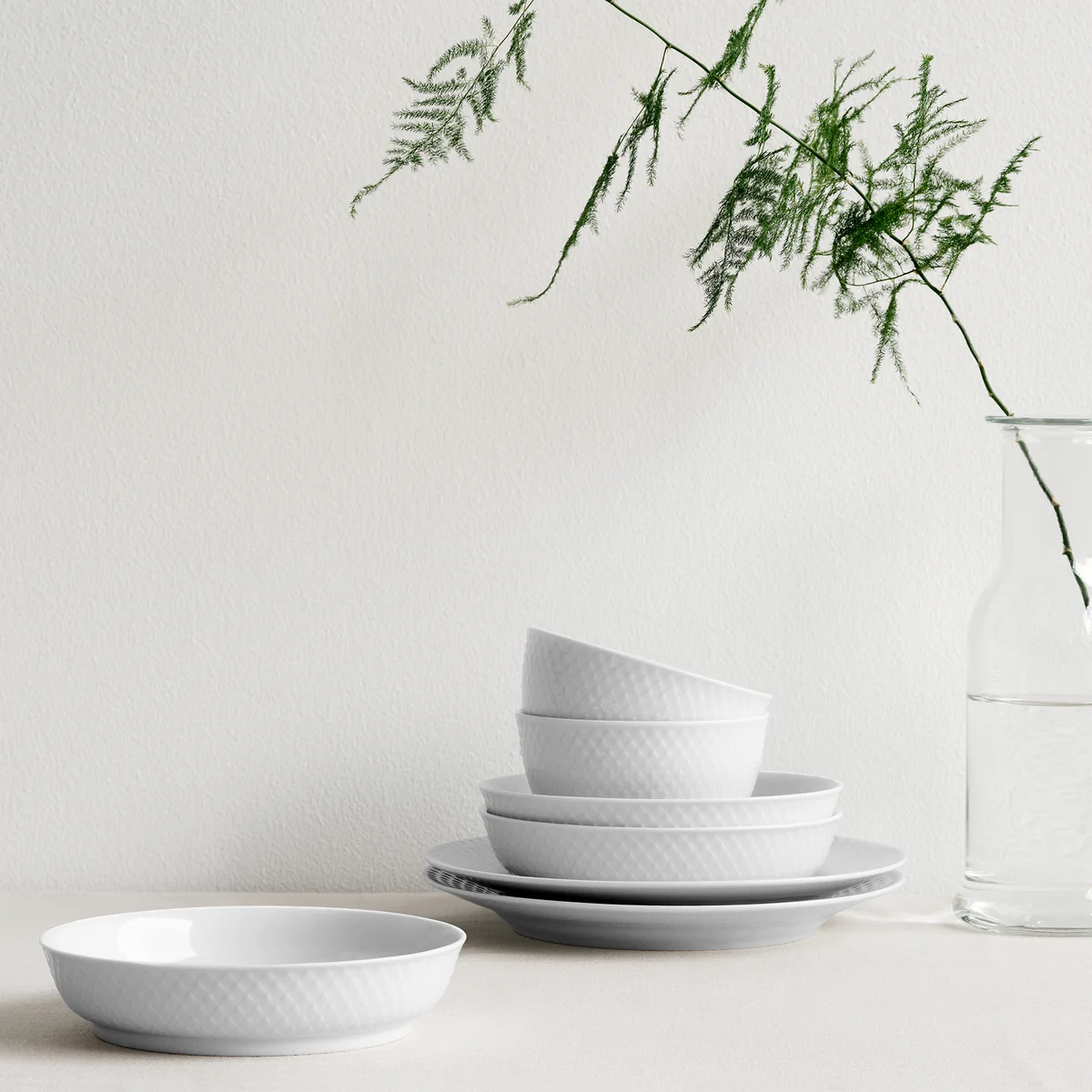 De Rhombe kom maakt deel uit van de gelijknamige serie van Lyngby Porcelæn en wordt gekenmerkt door het ingewikkelde ruitpatroon op het porselein. Het patroon komt oorspronkelijk uit de Danild-serie die in 1961 werd ontworpen. Destijds werd het als een decal (afdruk) op het porselein aangebracht, maar tegenwoordig is het patroon in reliëf op het oppervlak van de kom aangebracht. Tot op de dag van vandaag heeft het patroon niets van zijn charme verloren en ziet het er geweldig uit op zowel klassieke als moderne tafels.