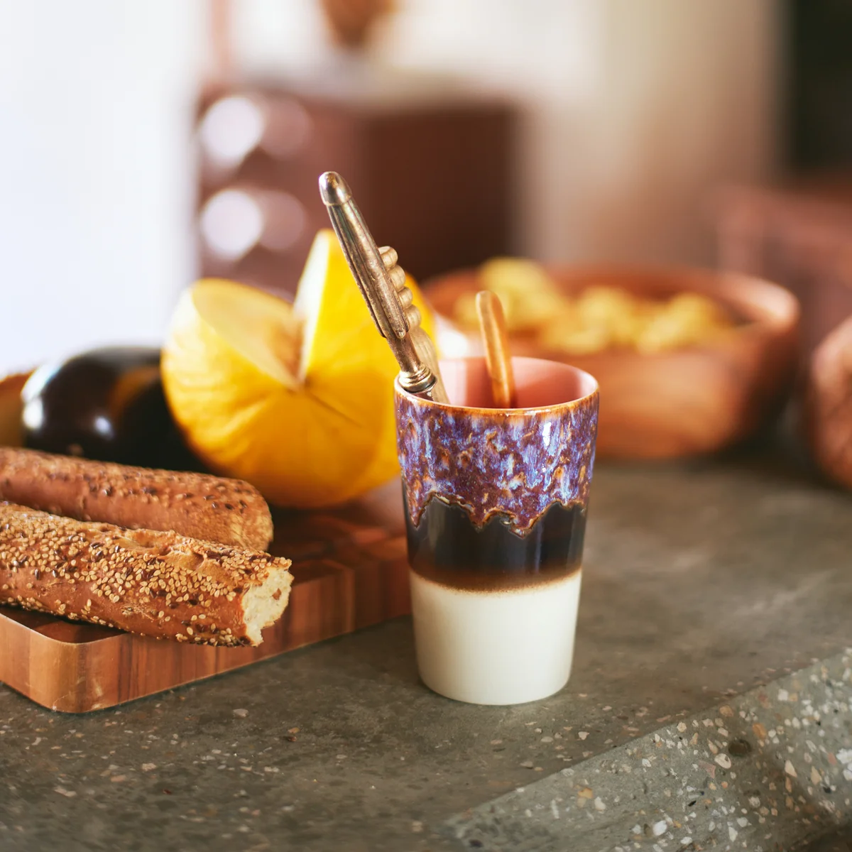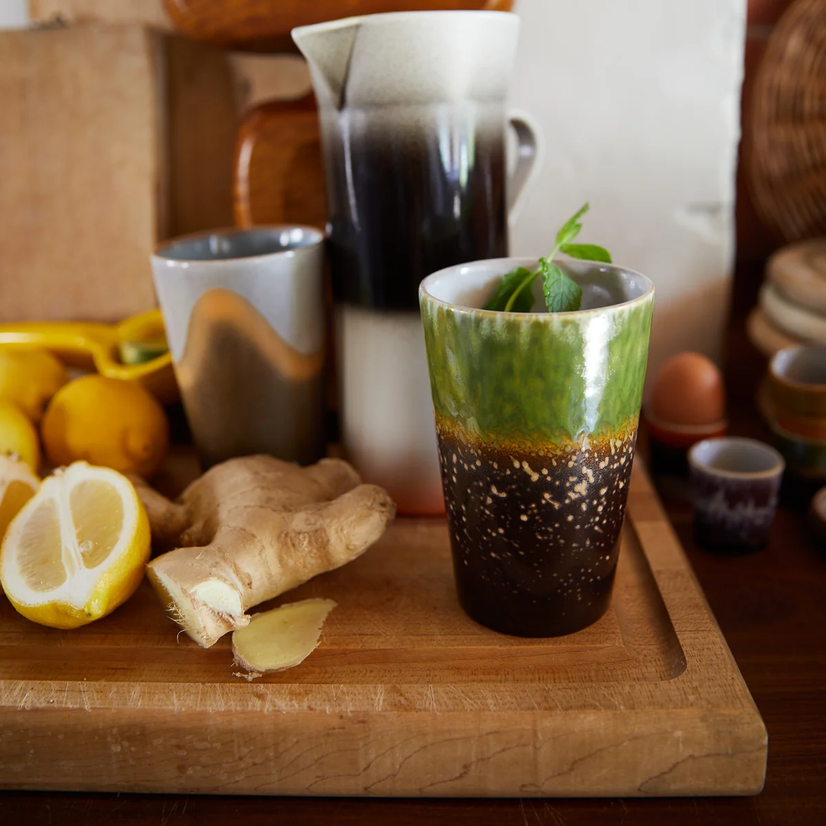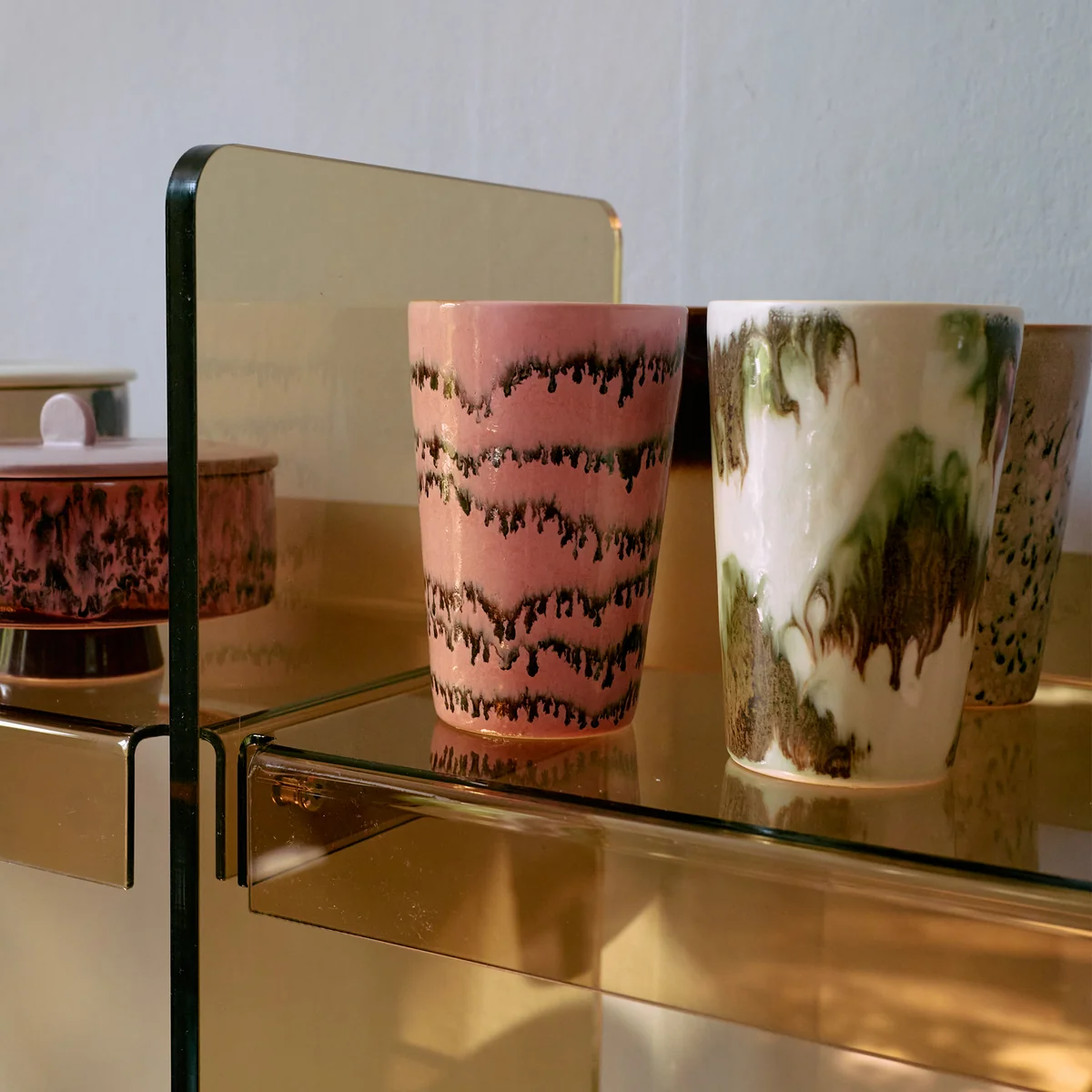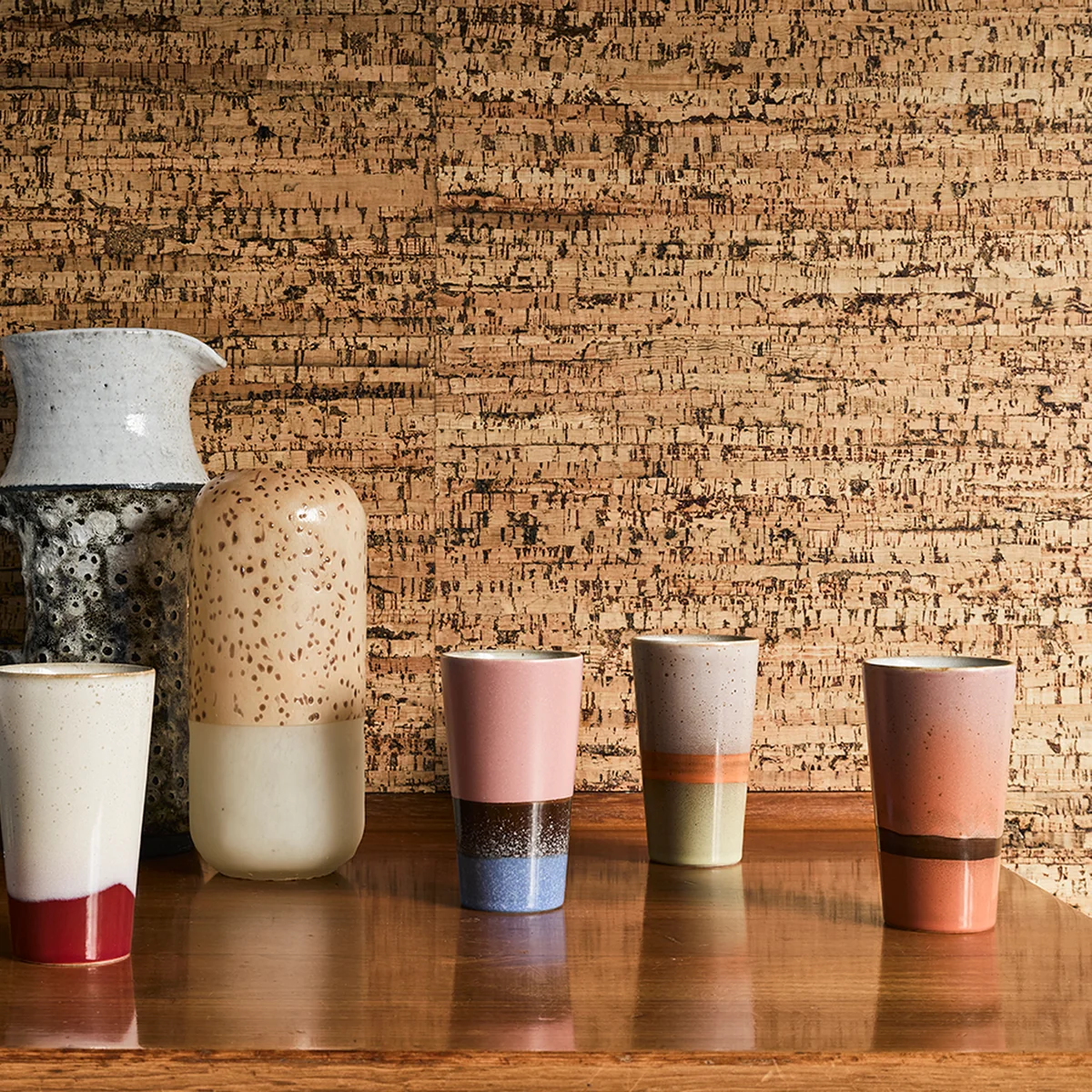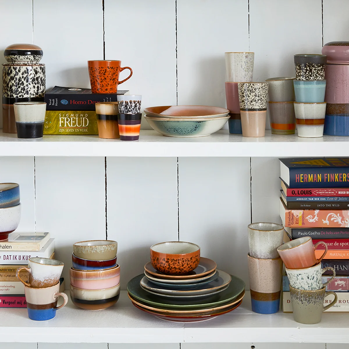 70's HKliving Een reden om blij te zijn voor zowel jarenlange verzamelaars als nieuwe ontdekkers: de steengoed theemokken van zijn net zo uniek als iemands vingerafdruk, omdat ze met de hand worden gemaakt en geglazuurd. Dit zorgt voor de prachtige patronen en kleuren die elke eettafel en kast individueel verfraaien.