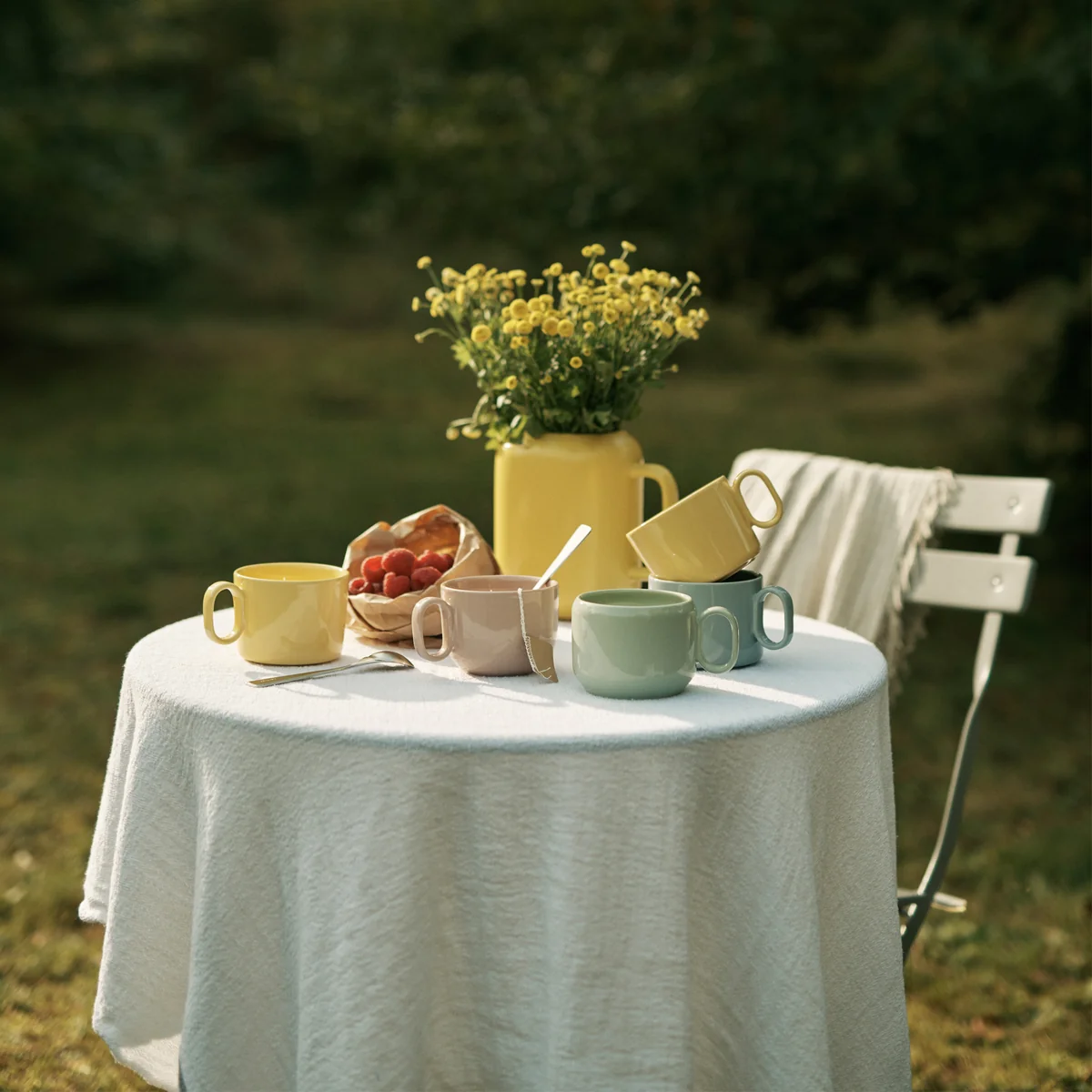 De mokken met handvat hebben een inhoud van 290 ml en zijn gemaakt van steengoed. De kopjes zijn van binnen en van buiten geglazuurd, gemakkelijk schoon te maken in de vaatwasser en ook geschikt voor de magnetron.