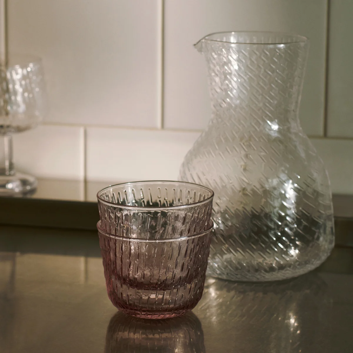 Een verfijnd, genuanceerd en tastbaar gevoel van regen is vastgelegd in de glazen producten, als een organische, reliëfachtige oppervlaktestructuur die is aangebracht op een schetsmatige manier die typerend is voor de ontwerper.