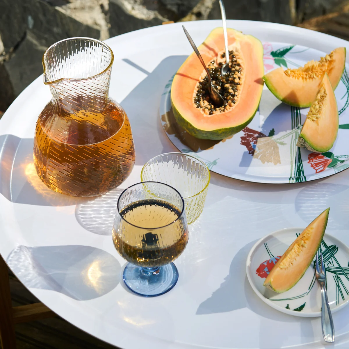 Het Syksy drinkglas van Marimekko is gemaakt van mondgeblazen glas. De serie Syksy (Autumn) glass series, ontworpen door Matti Klenell, gaat verder met de verkenning van de natuur en weersverschijnselen die bekend zijn uit de drukkunst Marimekko . Het overkoepelende thema van de nieuwe serie is de vormen van herfstregen, van een zachte motregen tot krachtige, doordringende buien.