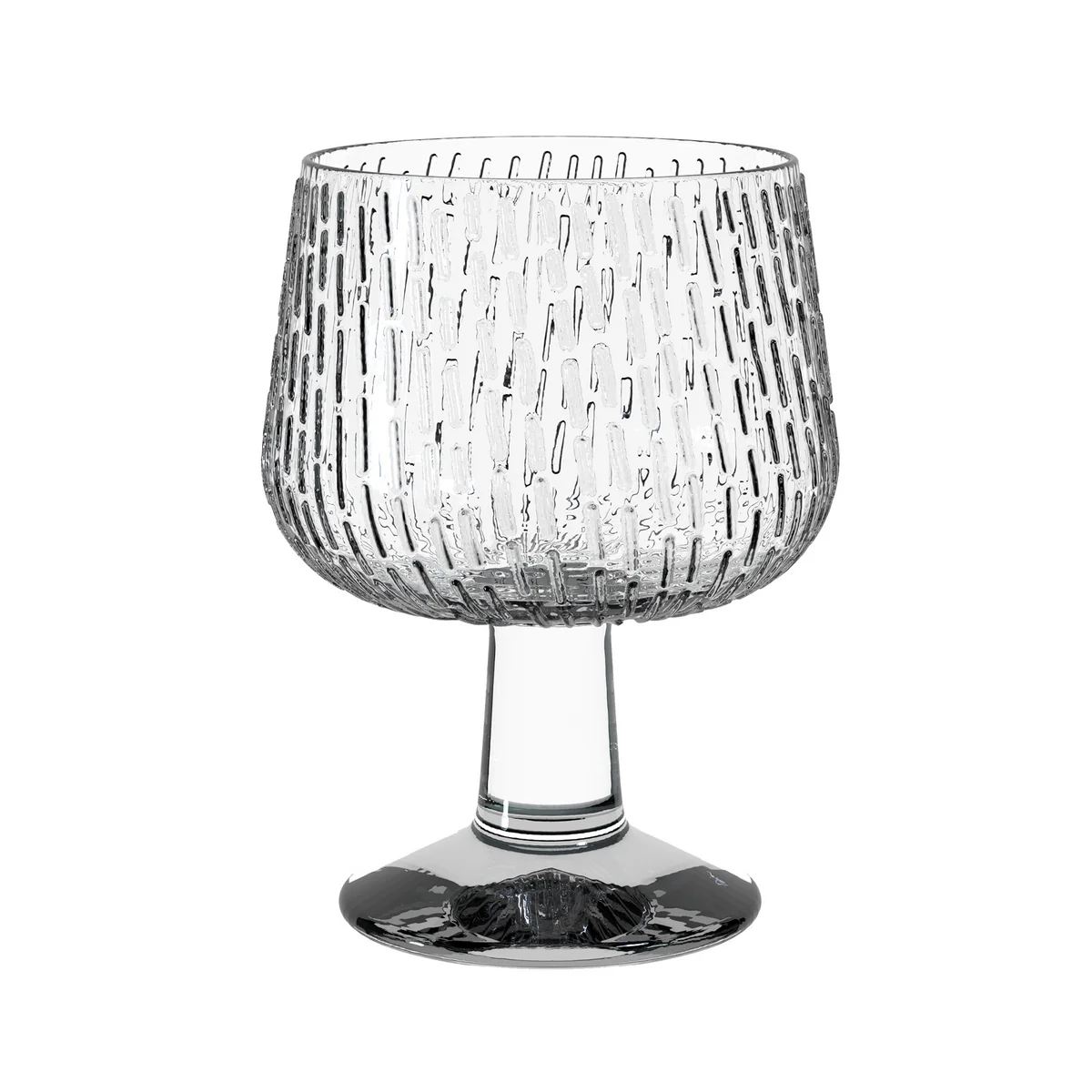 Het Syksy wijnglas van Marimekko is gemaakt van mondgeblazen glas. Syksy De (Autumn) glasserie, ontworpen door Matti Klenell, gaat verder met de verkenning van de natuur en weersverschijnselen die bekend zijn uit de drukkunst Marimekko . Het overkoepelende thema van de nieuwe serie is de vormen van herfstregen, van een zachte motregen tot krachtige, doordringende buien.