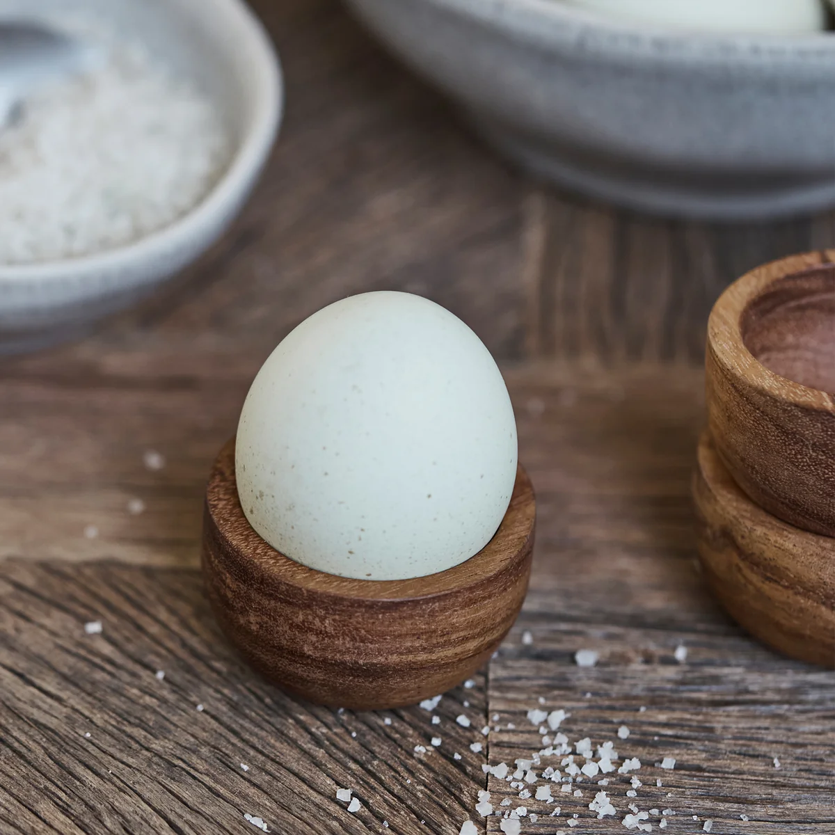 Deze stijlvolle eierdopjes van acaciahout combineren een minimalistisch design met een warme, natuurlijke uitstraling. Ze passen harmonieus in elke tafelsetting en brengen een vleugje rustieke charme in het dagelijks leven. Dankzij hun veelzijdigheid zijn ze niet alleen geschikt als klassieke eierdopjes, maar ook als kleine containers voor zout, peper of andere kruiden.
