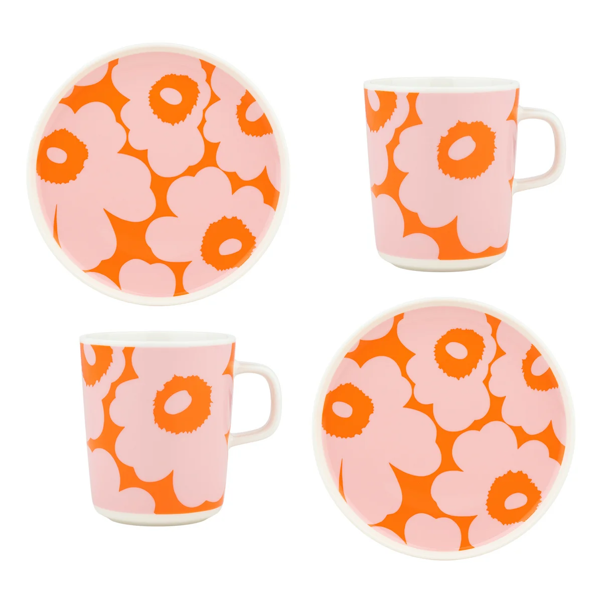 De dinerset bevat twee kopjes (2,5 dl), twee diepe borden (20,5 cm) en twee dinerborden (25 cm) - ideaal voor gezellige avonden of speciale gelegenheden. De ontbijtset bevat twee grote kopjes (4 dl) en twee borden (20 cm), perfect om de dag mee te beginnen. Beide sets zijn verpakt in een elegante doos met het Marimekko logo en zijn ook een prachtig cadeau.