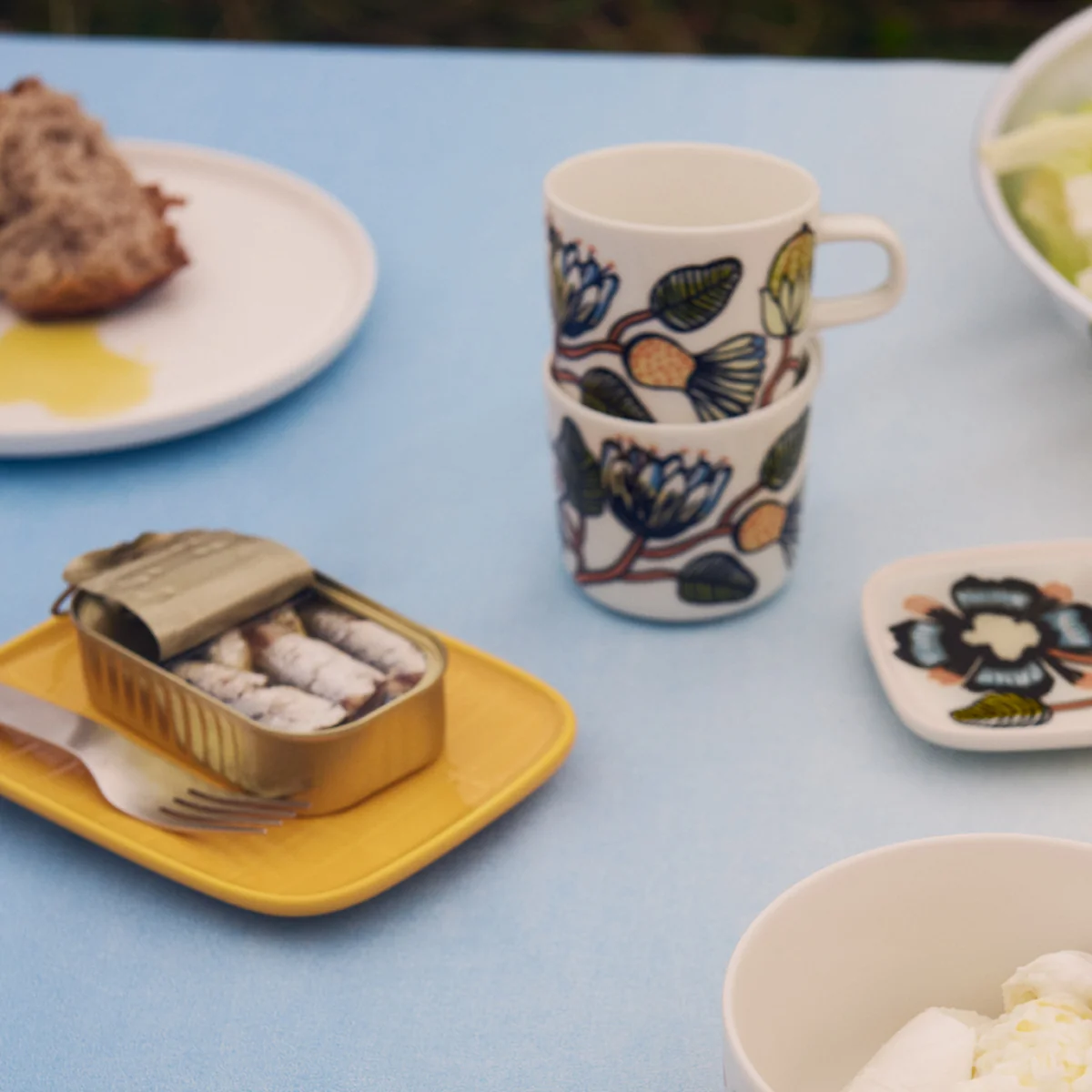Het reliëfachtige Tiiliskivi -patroon weerspiegelt Ratia's geloof in de schoonheid van het alledaagse. Dit dienblad geeft een bijzonder karakter aan het dagelijkse serveren of eten en is een opvallend middelpunt op de eettafel. Natuurlijk kan het bord ook voor decoratieve doeleinden gebruikt worden.