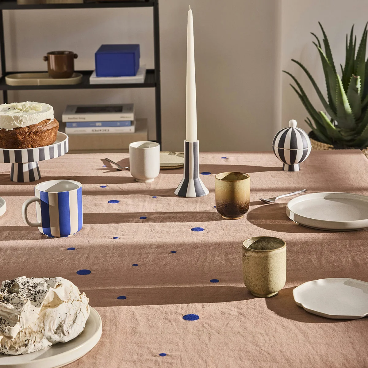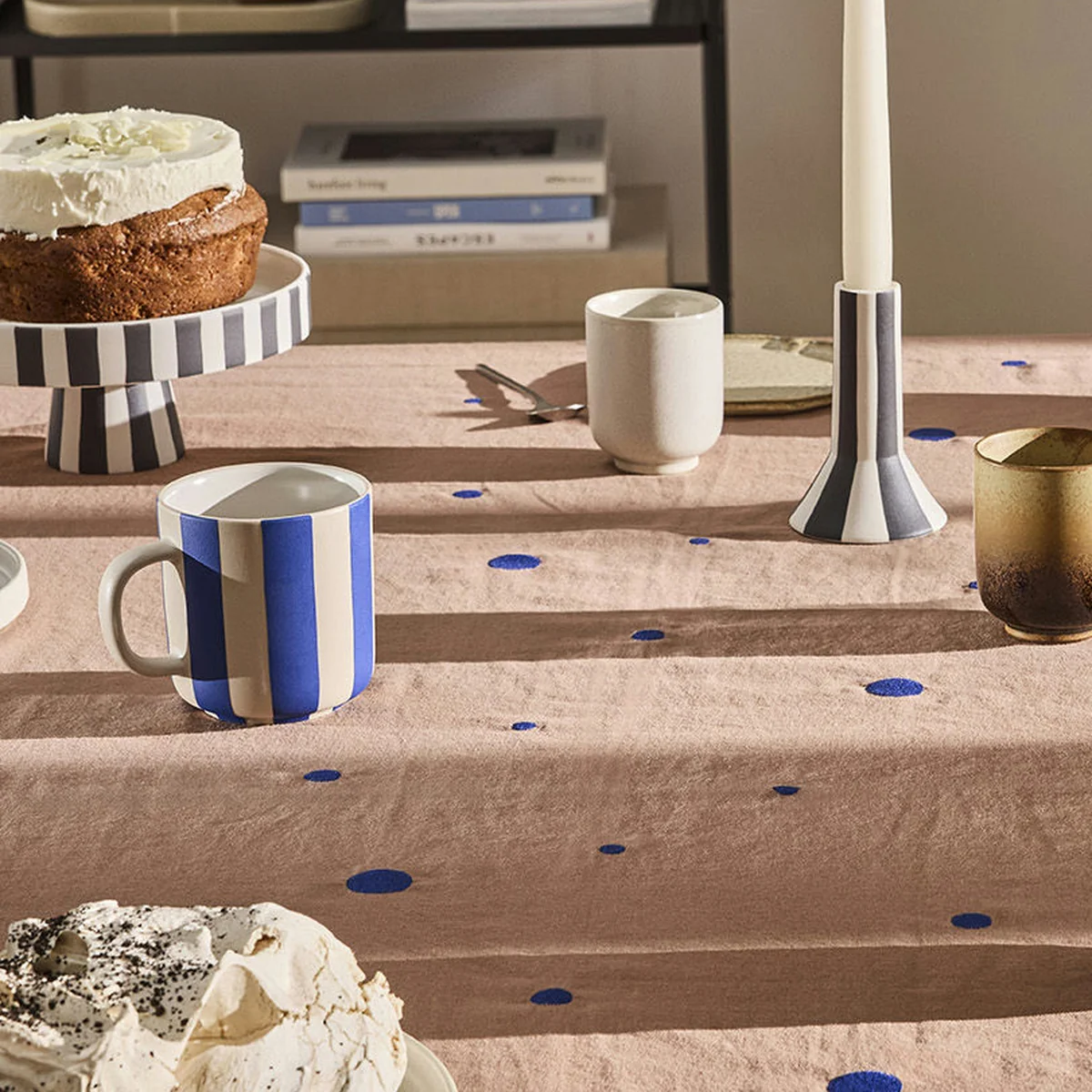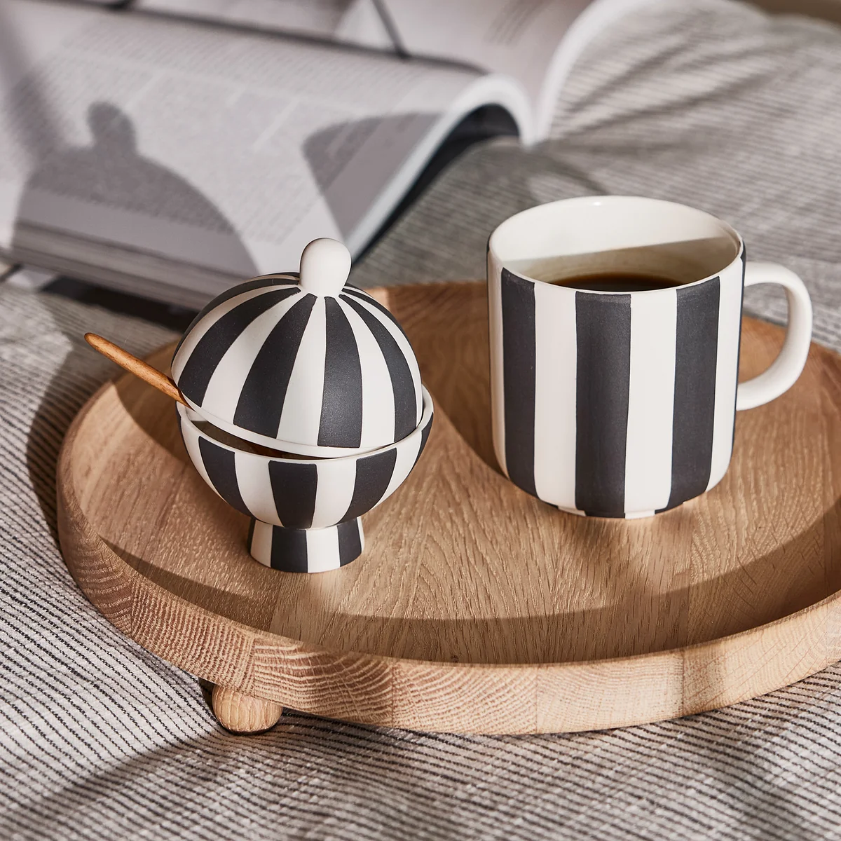 De eenvoudige vorm van de mok wordt op een unieke manier onderbroken door het opvallende, handgeschilderde streeppatroon. De combinatie van strakke lijnen en subtiele accenten geeft de Toppu mok een tijdloze esthetiek die naadloos past in elke keukenstijl. Het handvat is ergonomisch ontworpen zodat de beker comfortabel in de hand ligt.