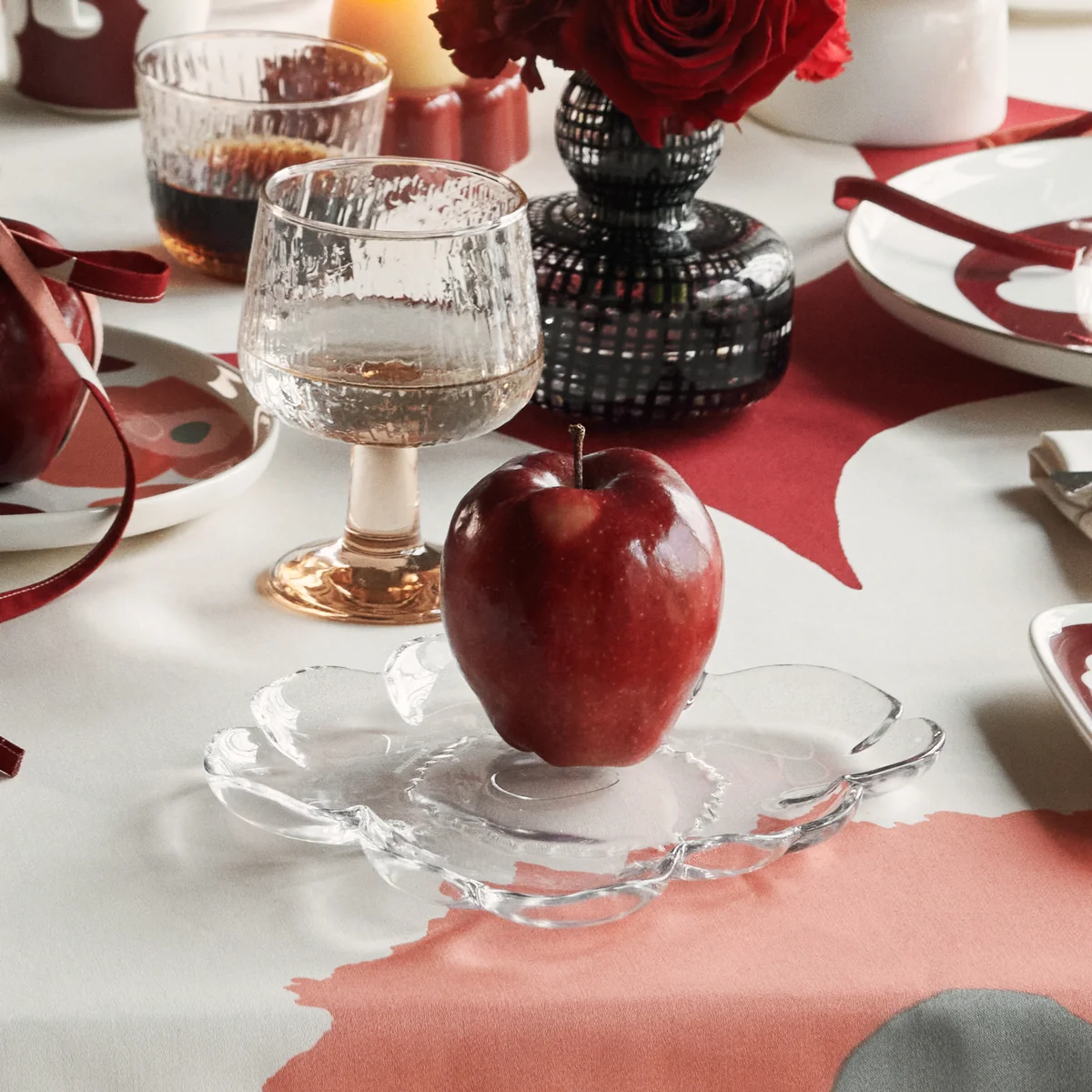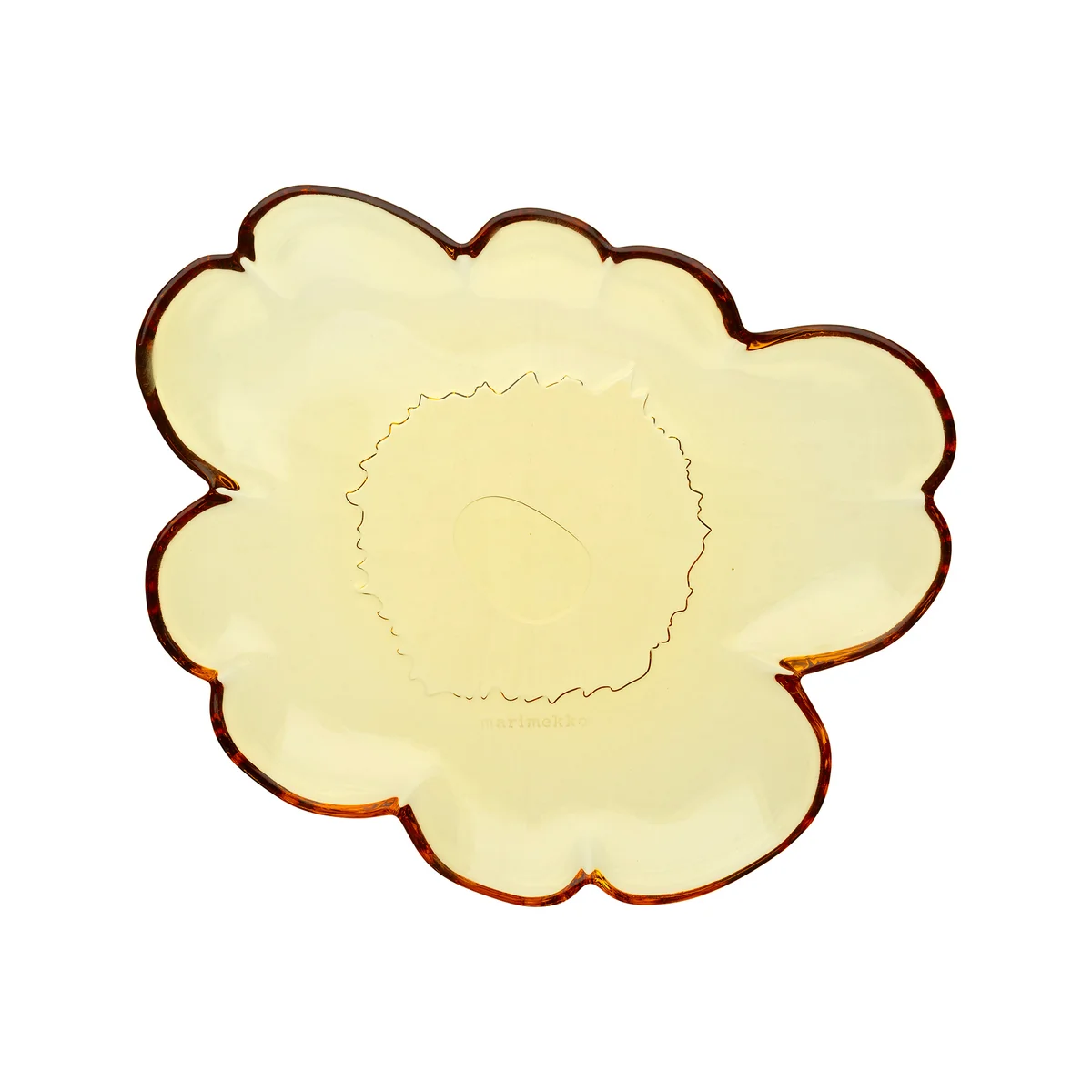 Het bloemvormige Unikko glazen bord van Marimekko . Het wordt aanbevolen om dit bord met de hand af te wassen om het unieke ontwerp te behouden. Het kan in de vaatwasser, maar wees voorzichtig, want het kenmerkende ontwerp kan beschadigd raken als het in contact komt met ander serviesgoed.
