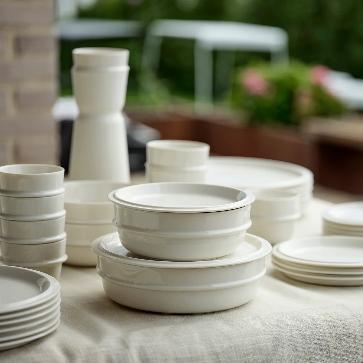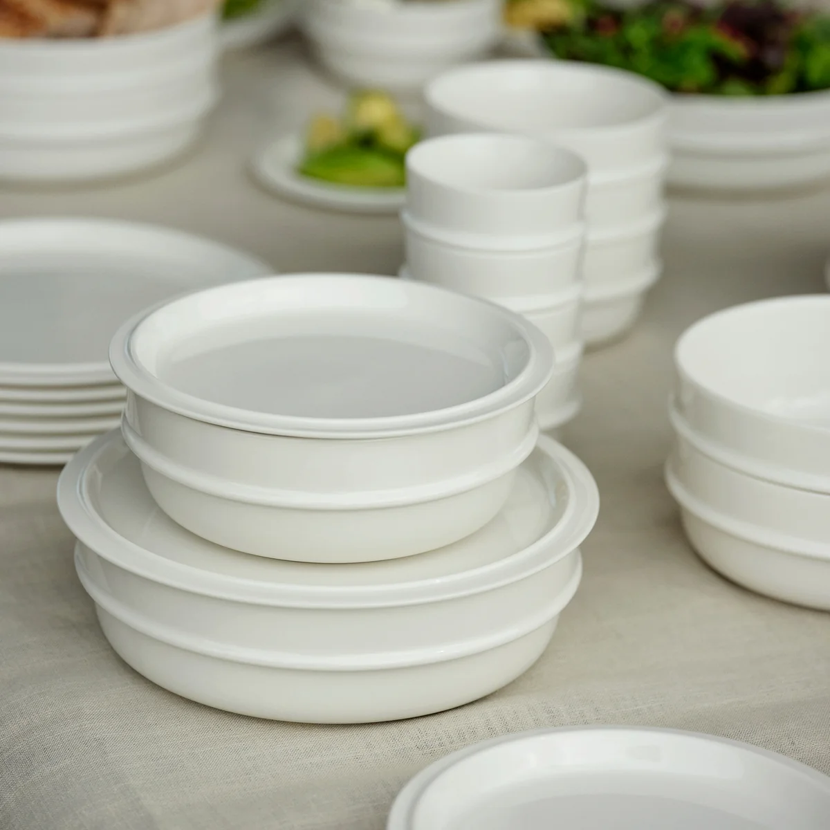 De Eau borden van Zone Denmark . De serviescollectie Eau is de moderne versie van een tijdloze klassieker. De esthetiek is heerlijk eenvoudig en maakt komaf met alle overbodige elementen. Het stapelbare ontwerp van de kopjes, kommen en co. maakt het niet alleen gemakkelijker om de tafel efficiënt te dekken en af te ruimen, maar optimaliseert ook het gebruik van de ruimte in de kast.