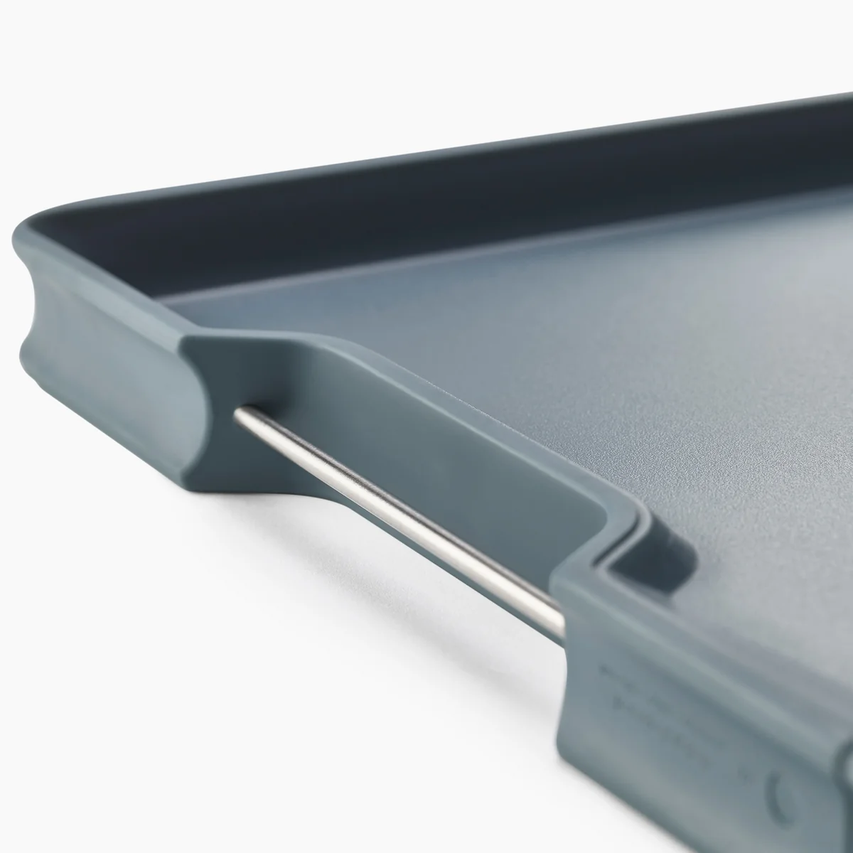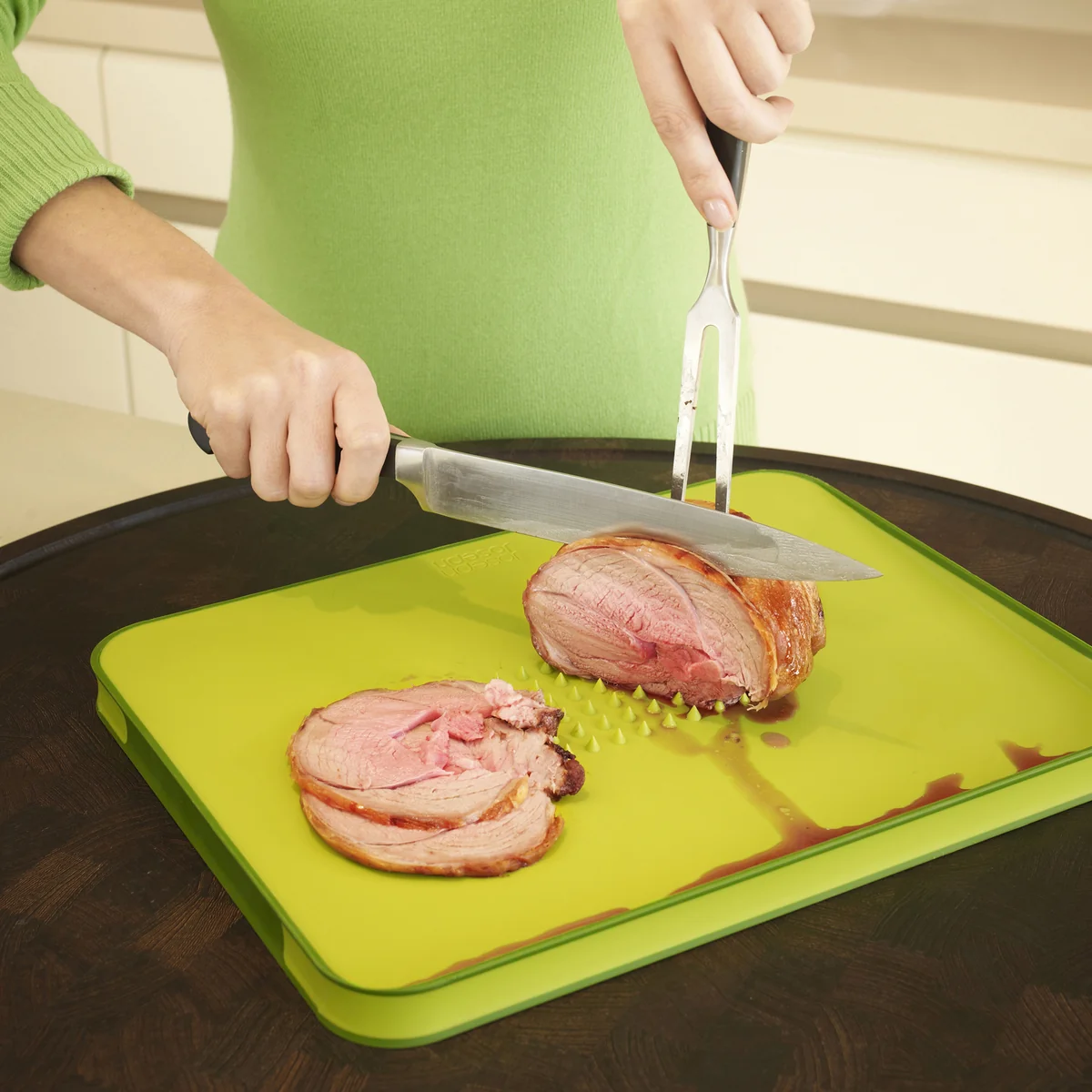Een ander bijzonder kenmerk is het schuine snijvlak en de opstaande rand van de snijplank. Cut & Carve Plus Dit maakt het gemakkelijk om eventuele vloeistoffen en snijresten op te vangen en over de hoek af te gieten. Cut & Carve Plus De snijplank heeft ook een siliconenrand die uitglijden voorkomt en zorgt voor een stevige grip.