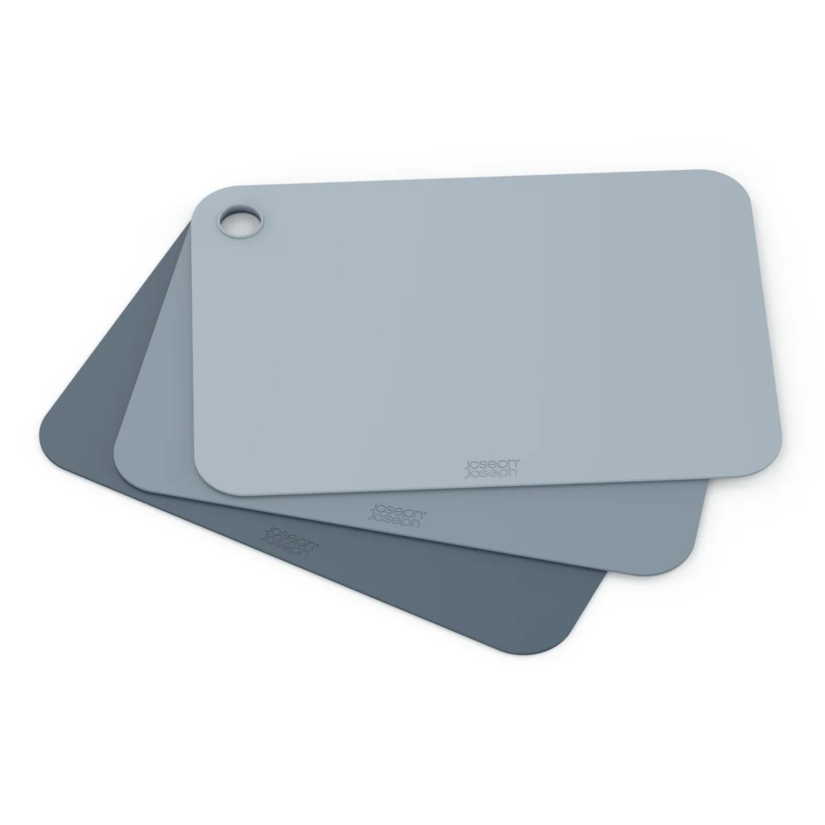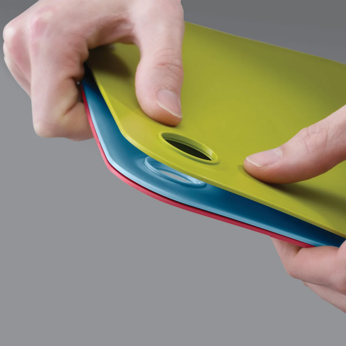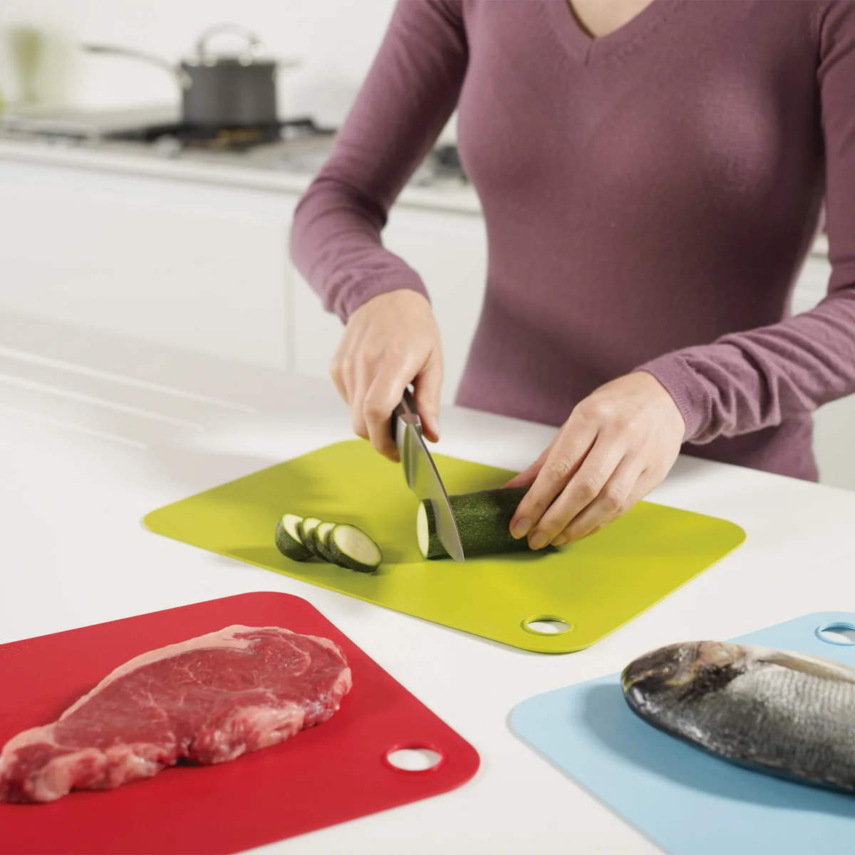 Elke plank heeft een dubbelzijdig, mesvriendelijk snijvlak en is duidelijk kleurgecodeerd: Hierdoor kunnen de individuele matten worden toegewezen aan verschillende voedingsmiddelen en wordt de kans op kruisbesmetting geminimaliseerd. Hun flexibiliteit betekent dat ze kunnen worden gebogen om gehakt voedsel in een pan of pot te leiden. Bovendien is het flexibele oppervlak een zachte snijbasis - niet alleen voor werkoppervlakken en tafels, maar ook voor messen.