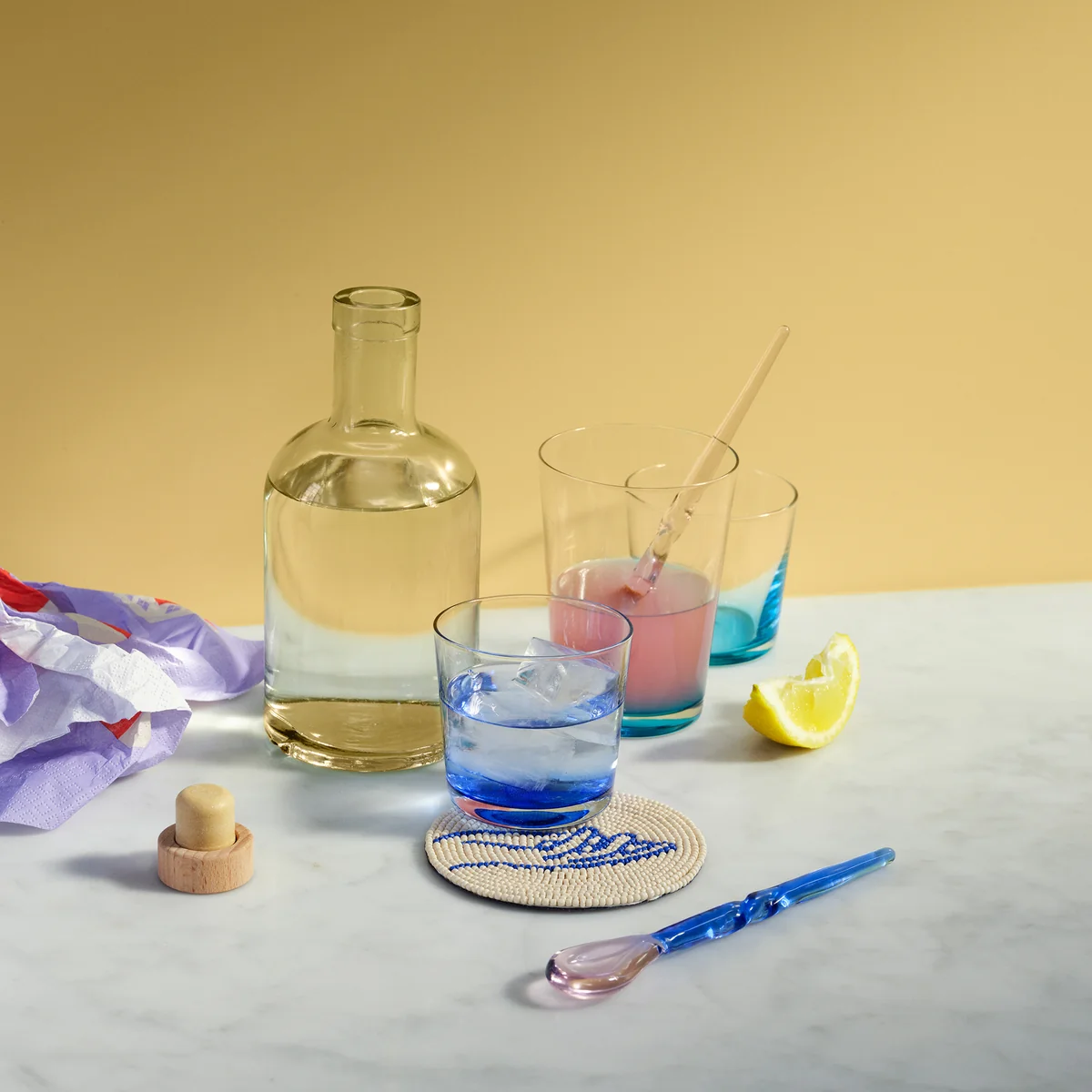 De Hue karaf van Broste Copenhagen overtuigt met zijn klassieke look. De kleurrijke achtergrond van de karaf voegt een modern tintje toe. Het is gemaakt van mondgeblazen glas, wat betekent dat er variaties in grootte en vorm kunnen zijn. Elk stuk is dus uniek. Hue kan optimaal worden geïntegreerd in het middelpunt van een elegante tafelsetting. Kan ideaal gecombineerd worden met de Hue drinkglas .