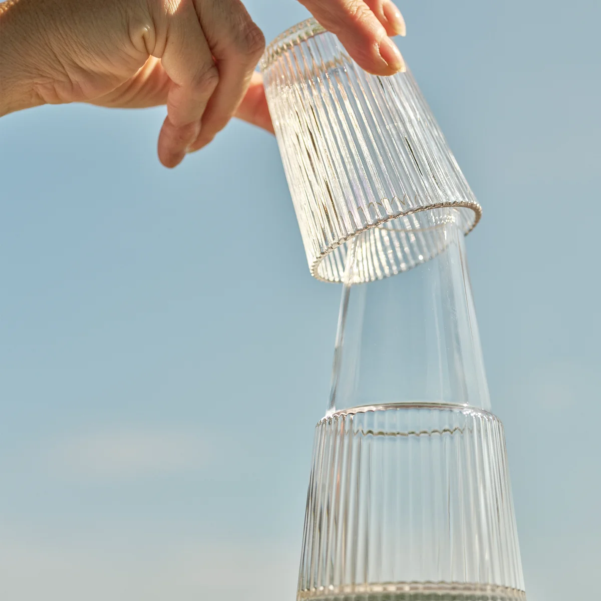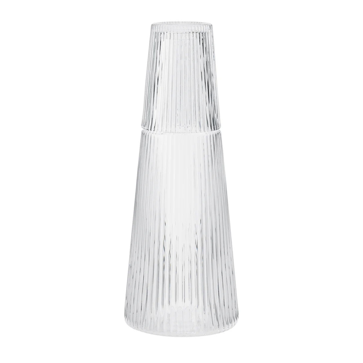De hoogwaardige karaf heeft een inhoud van 1 liter en wordt geleverd met een glas. Het glas dient tevens als deksel van de karaf. Beide hebben een gegroefd oppervlak dat het gevoel verbetert en voor een mooie lichtbreking zorgt. De karaf is een gegarandeerde blikvanger bij het serveren van gasten.