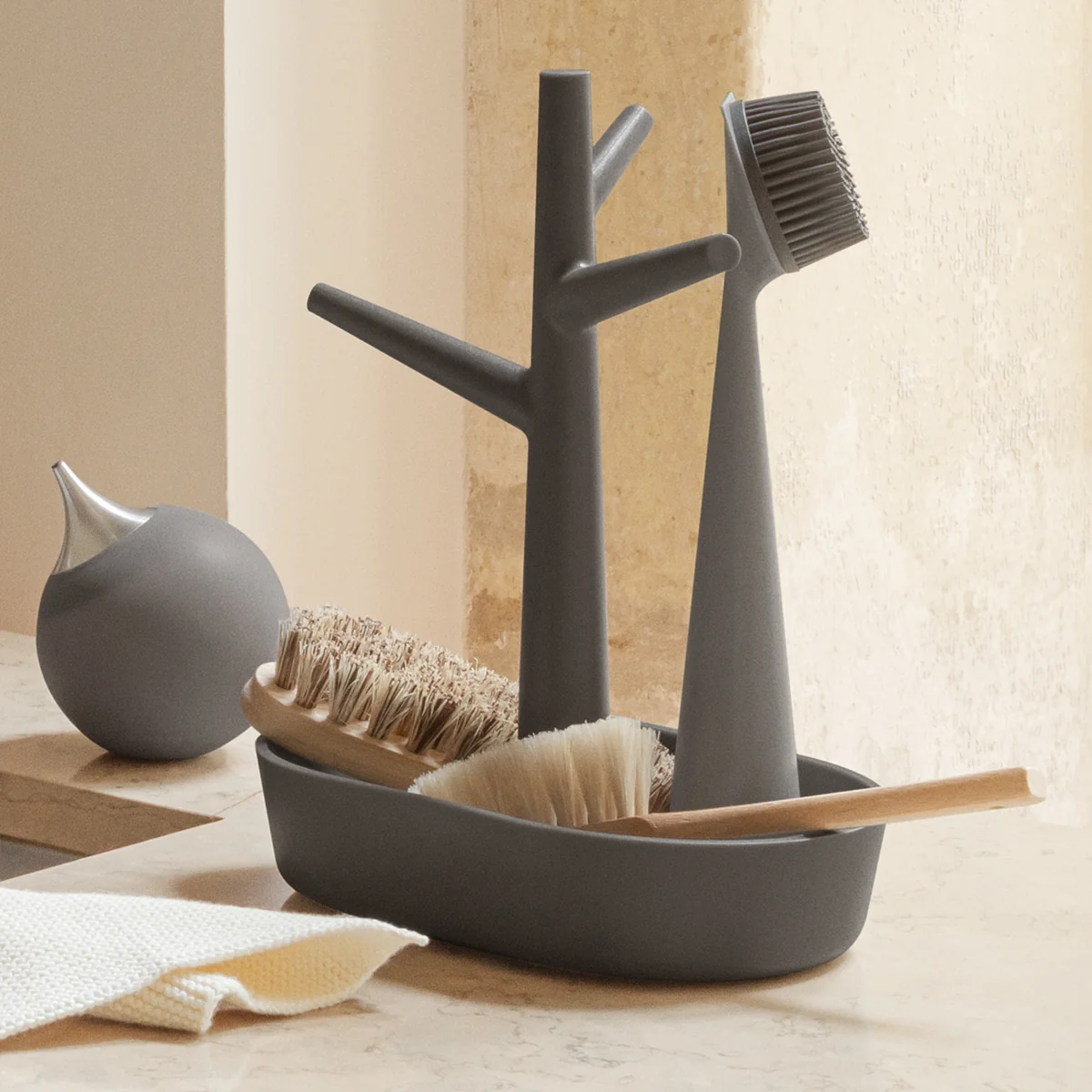 De keukenopberger is gemaakt van kunststof, is robuust en past dankzij zijn eenvoudige ontwerp in elke sfeer. De neutrale kleurstelling en de vorm, die het silhouet van een boom voorstelt, maken het geheel bijzonder esthetisch.