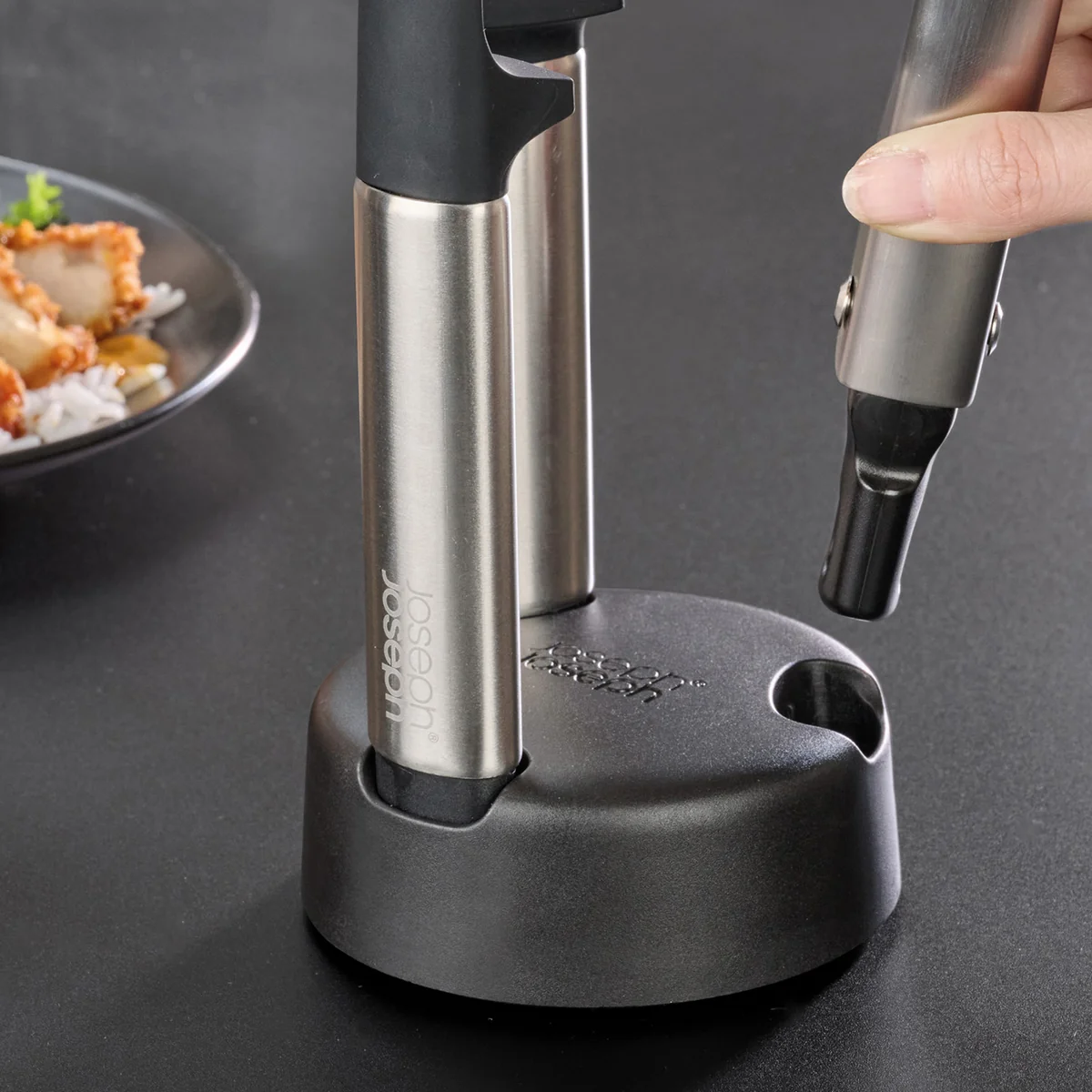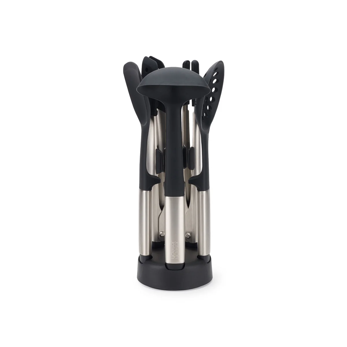 De set wordt geleverd in een compacte standaard die het keukengerei netjes opbergt. Zo heb je het gereedschap altijd bij de hand.