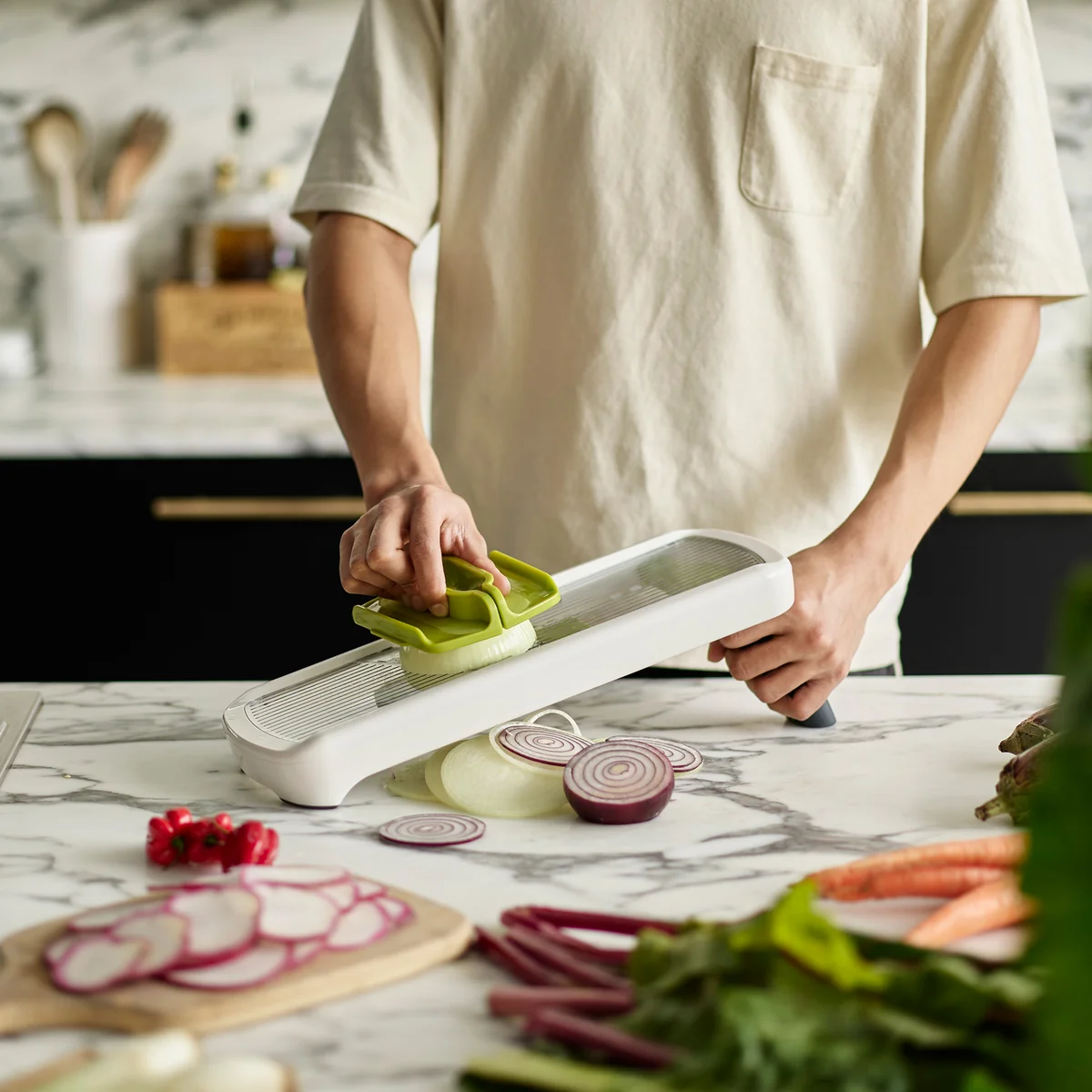 - Precisiehandgreep: Het unieke ontwerp biedt drie verschillende handgreepmodellen die perfect zijn afgestemd op individuele behoeften. De knijphandgreep is geweldig voor het snijden van kleine stukjes, terwijl de middelste handgreep ronde plakjes met gemak verwerkt. Met de platte handgreep kun je moeiteloos langere plakjes snijden.