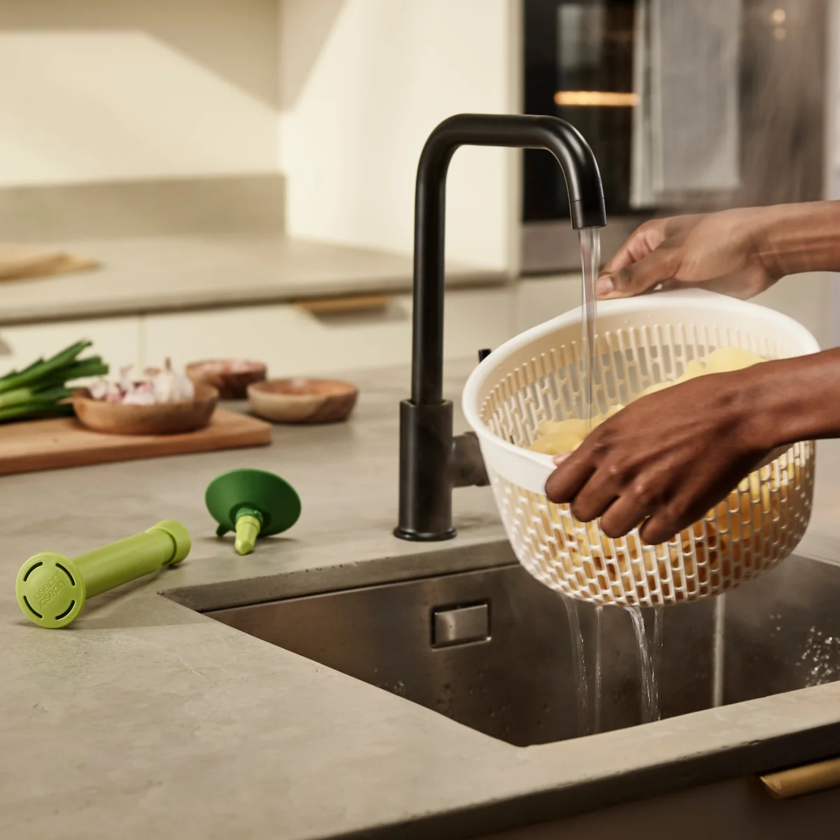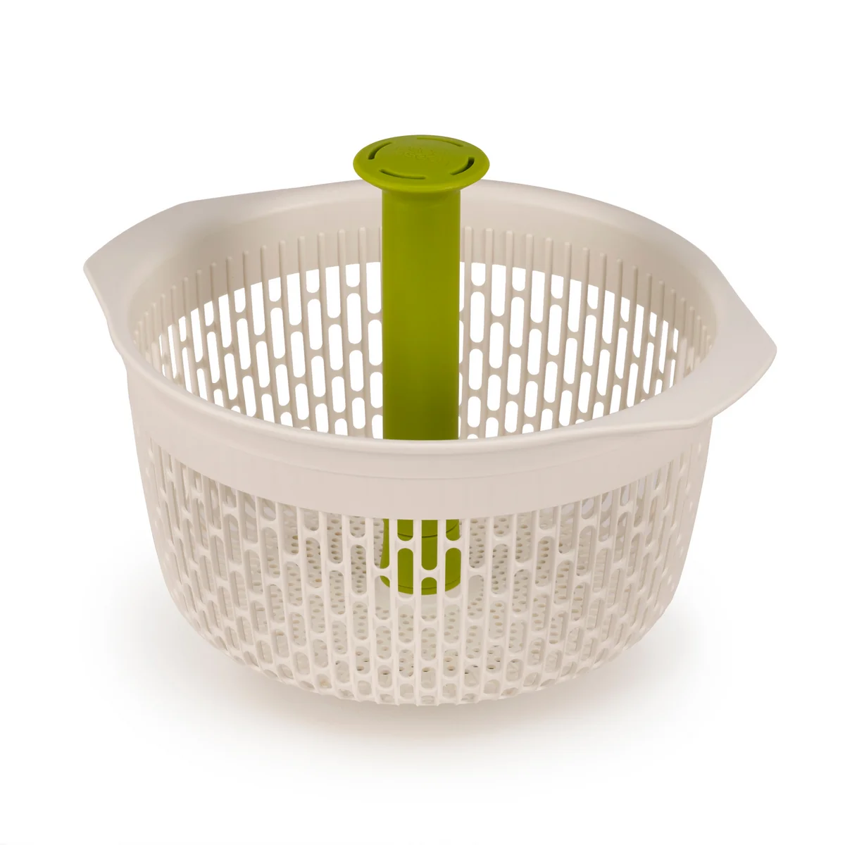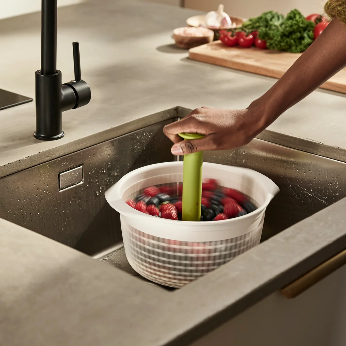 De Spindola slacentrifuge voor het aanrecht van Joseph Joseph maakt indruk met zijn innovatieve ontwerp. De combinatie van een slacentrifuge en een afdruiprek bespaart op een geweldige manier kostbare opslagruimte. Om de salade te bereiden worden de spindel en de zuignap gewoon op het afdruiprek bevestigd. De sla wordt erin gelegd en goed afgespoeld onder de kraan. Als de zeef met de zuignap aan de gootsteen is bevestigd, kan de spindel op en neer worden gepompt om de zeef te draaien en het overtollige water af te voeren. Als het conventionele vergiet moet worden gebruikt, worden de spil en de zuignap gewoon verwijderd en worden de zijgrepen gebruikt.