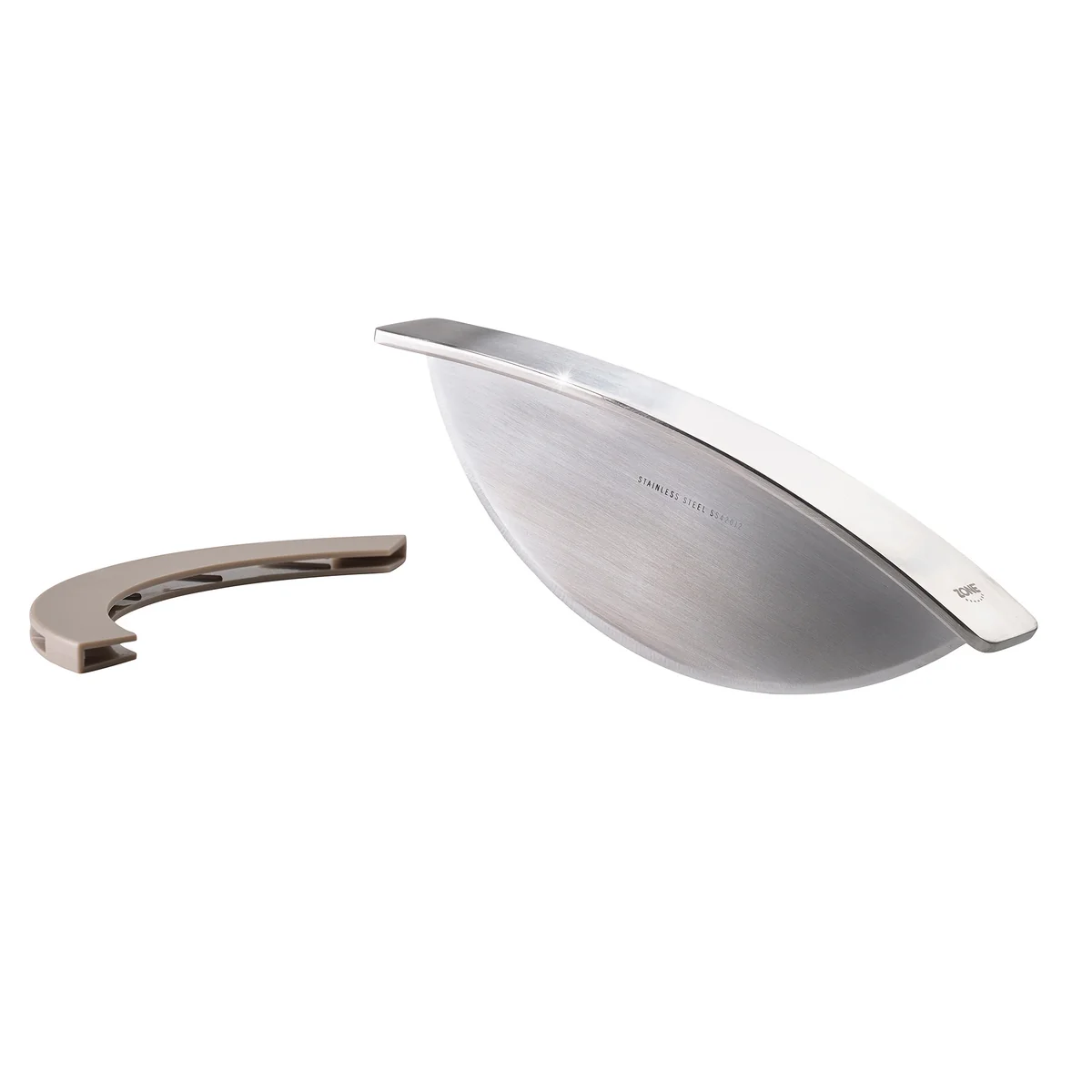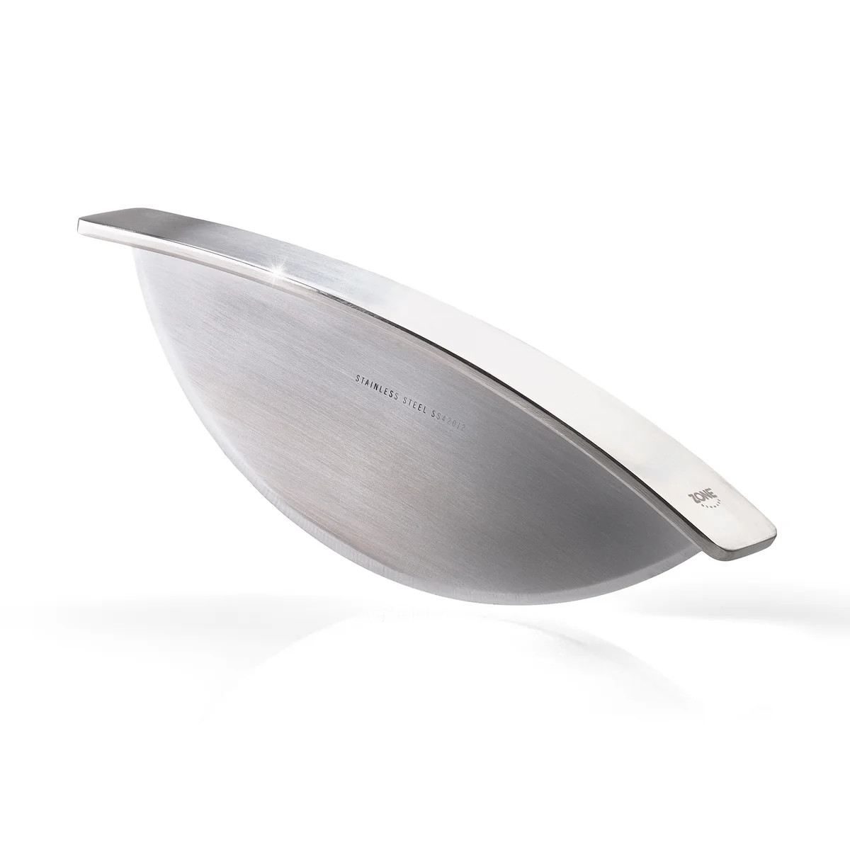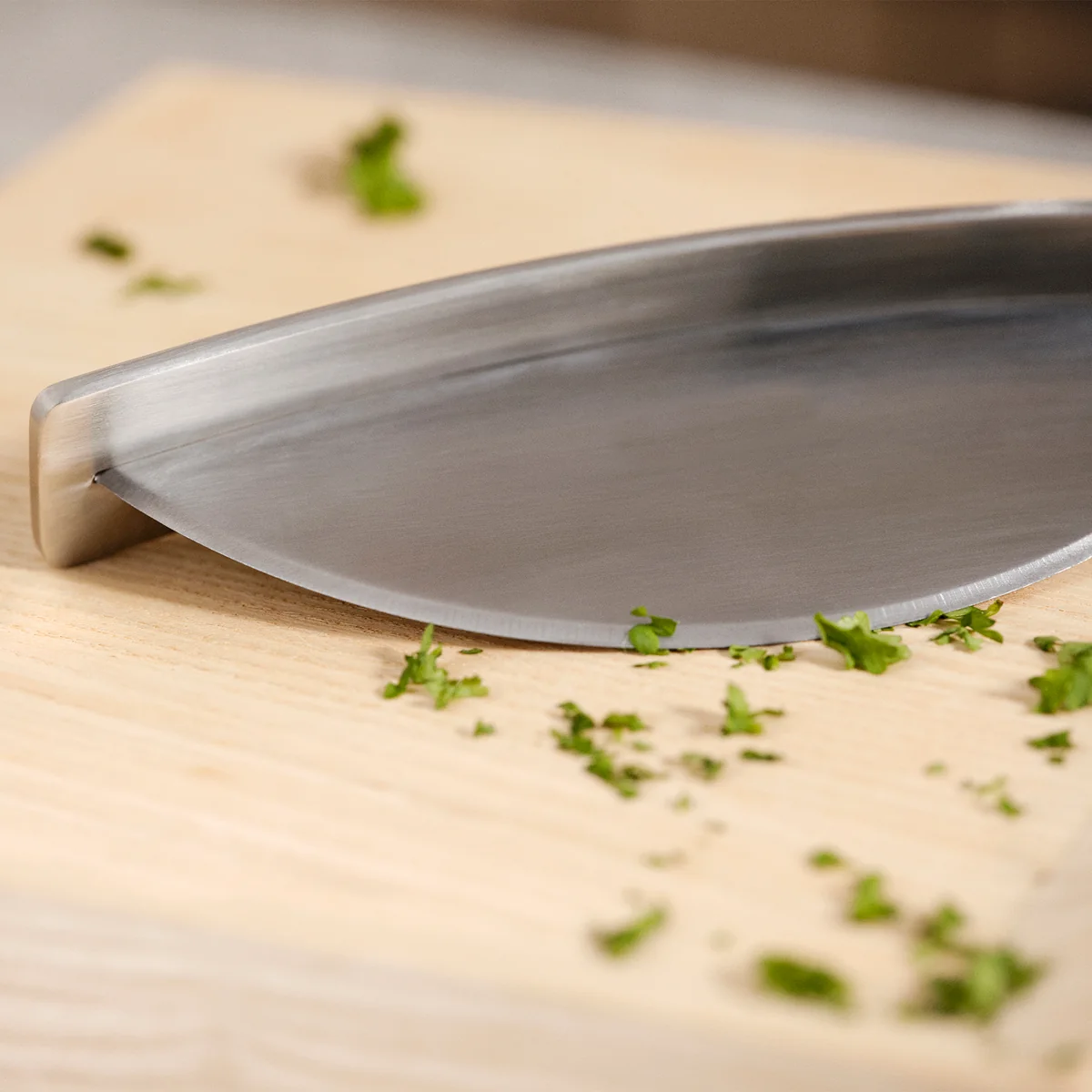 Een onmisbaar keukengerei in een handig formaat. Met zijn gebogen sikkelvorm kun je met dit mes moeiteloos en prettig kruiden, noten en nog veel meer fijnhakken. Het mes neemt weinig ruimte in beslag in je lade dankzij de meegeleverde plastic rail die het scherpe stalen lemmet beschermt. Om de scherpte lang te behouden, raden we aan het mes met de hand af te wassen. Het is trouwens ook perfect voor het snijden van pizza!